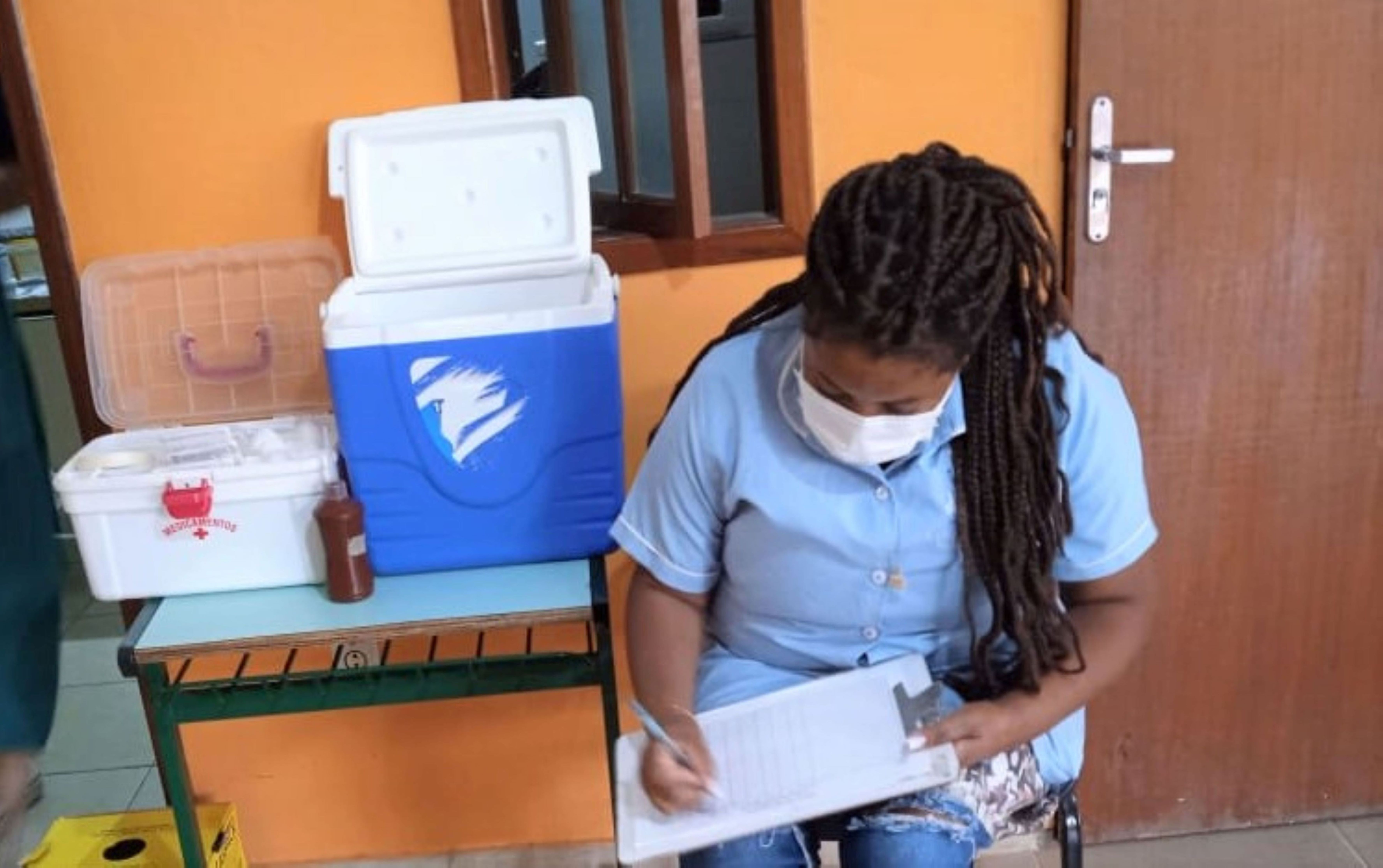 Enfermeira concluindo seus relatórios após a realização da ação de imunização num dos educandários do município