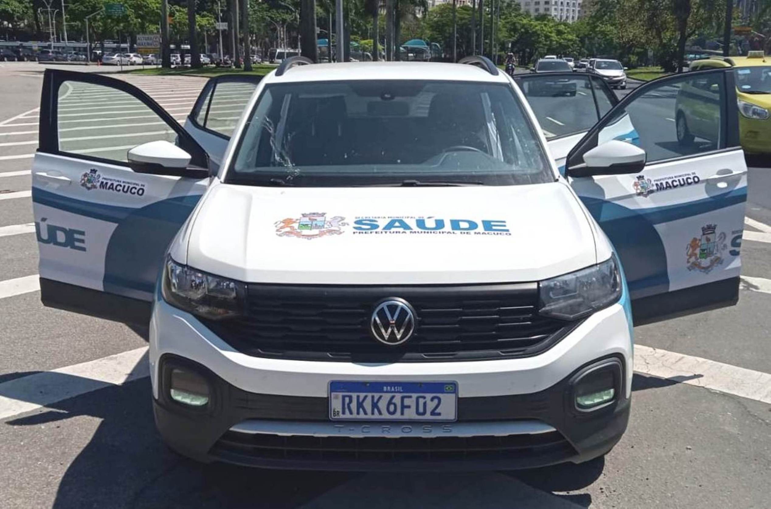 Nas laterais do veículo são facilmente notadas as inscrições da Prefeitura de Macuco na parte superior da porta e da Secretaria de Saúde mais abaixo