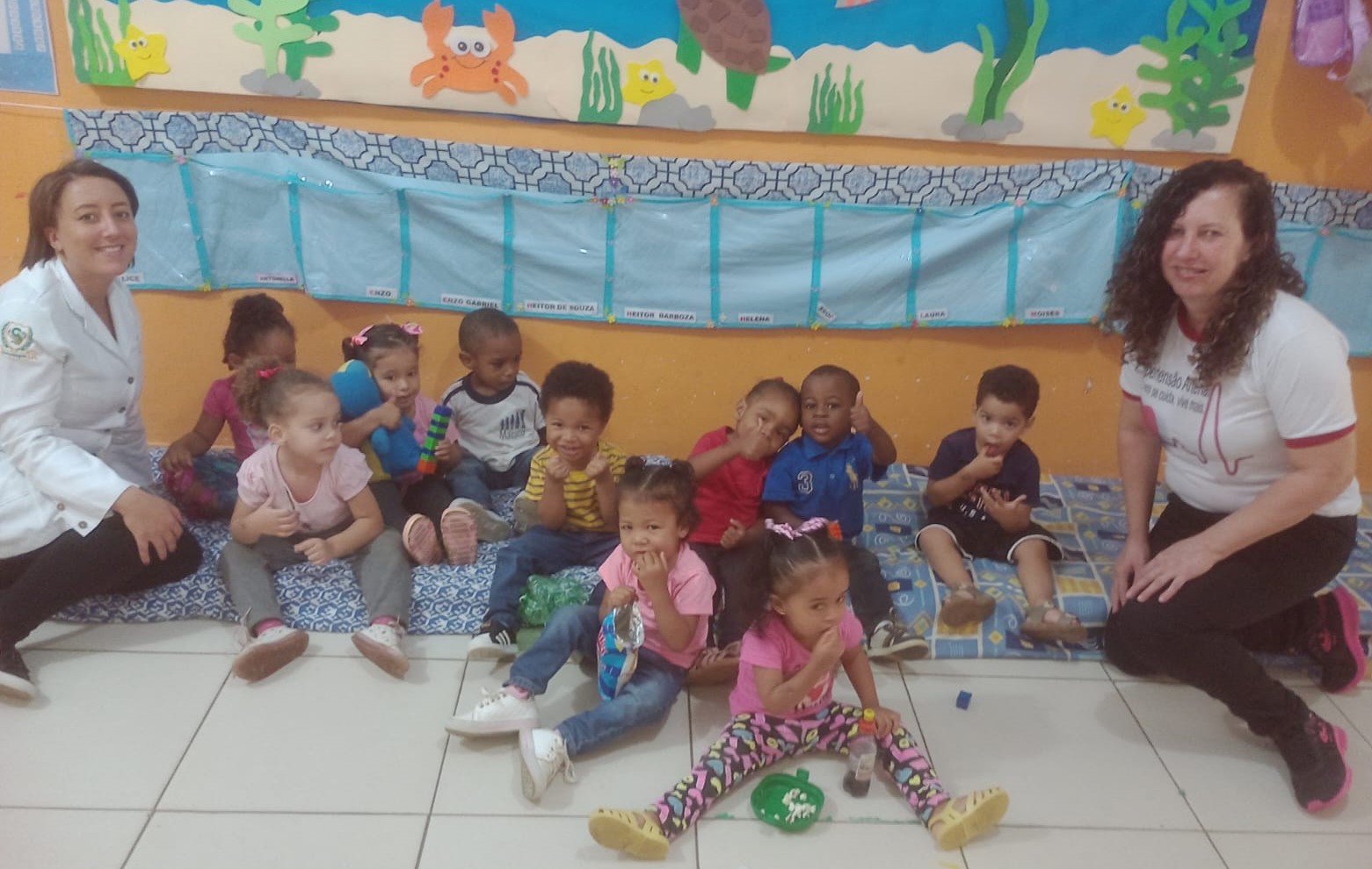 O carinho com a criançada dos educandários municipais é uma marca registrada das profissionais de saúde de Macuco
