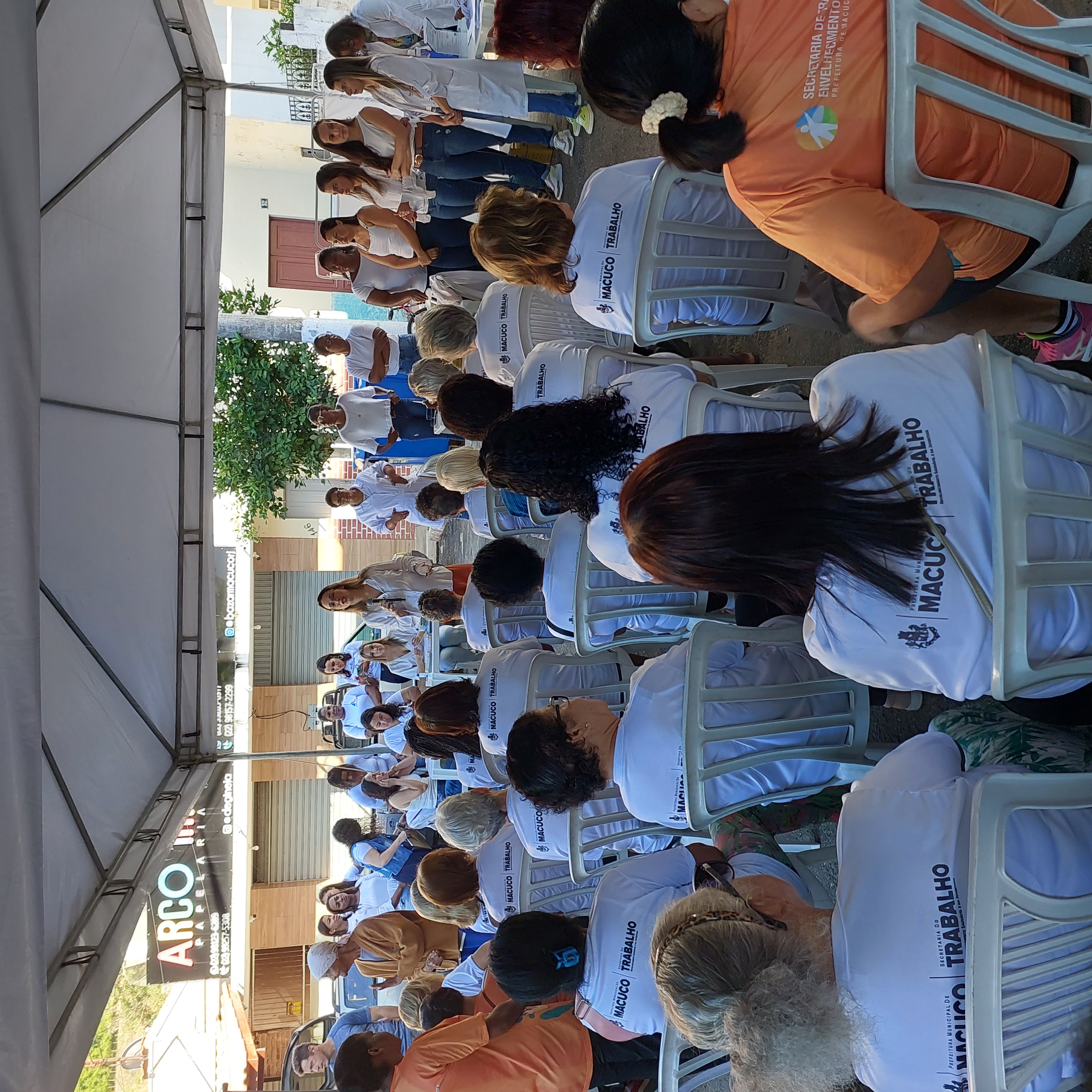Foto coletiva dos participantes com as autoridades durante a ação realizada no centro de Macuco nesta quarta-feira, dia 26 de abril