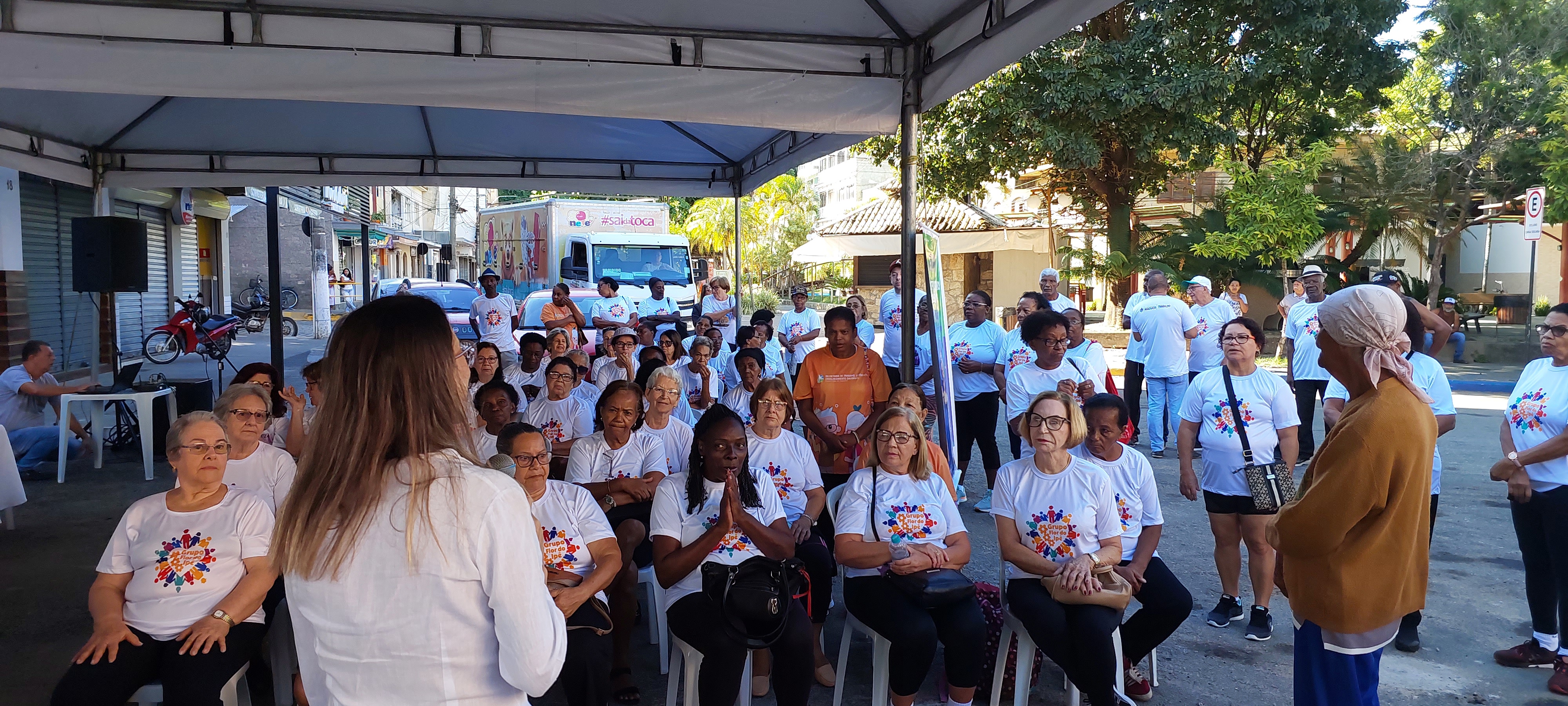 Participantes da ação de conscientização sobre hipertensão ouvem atentamente as orientações da enfermeira Verônica Golinelli