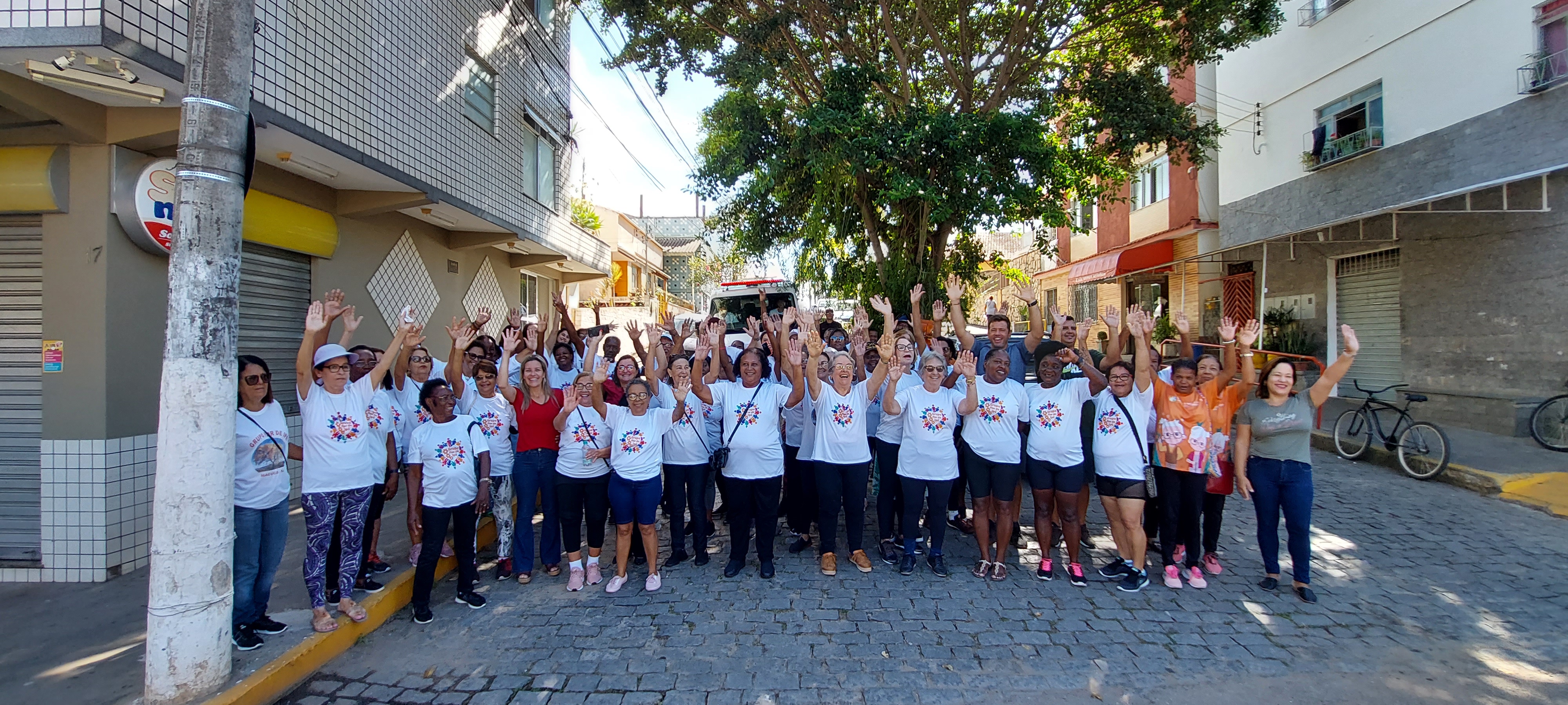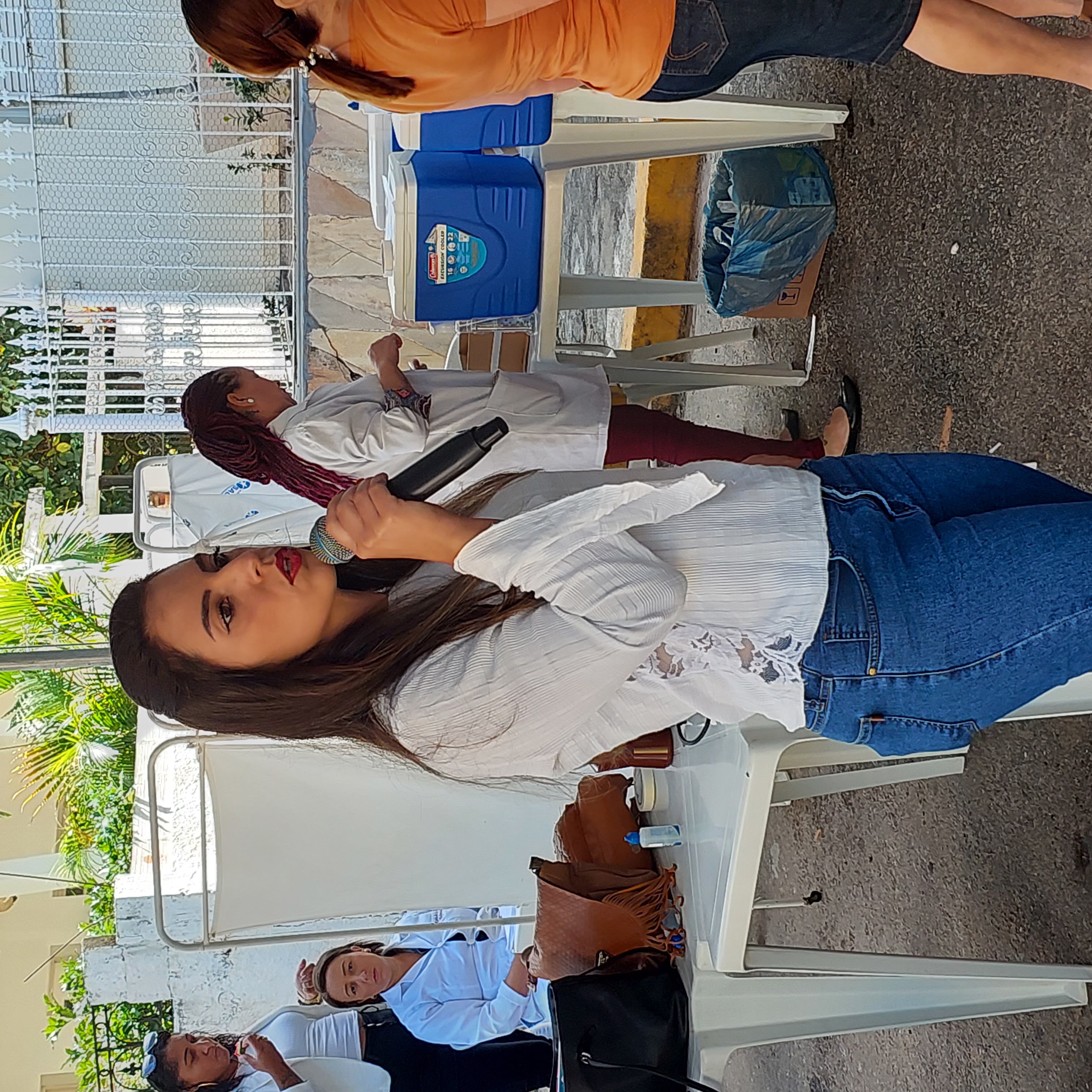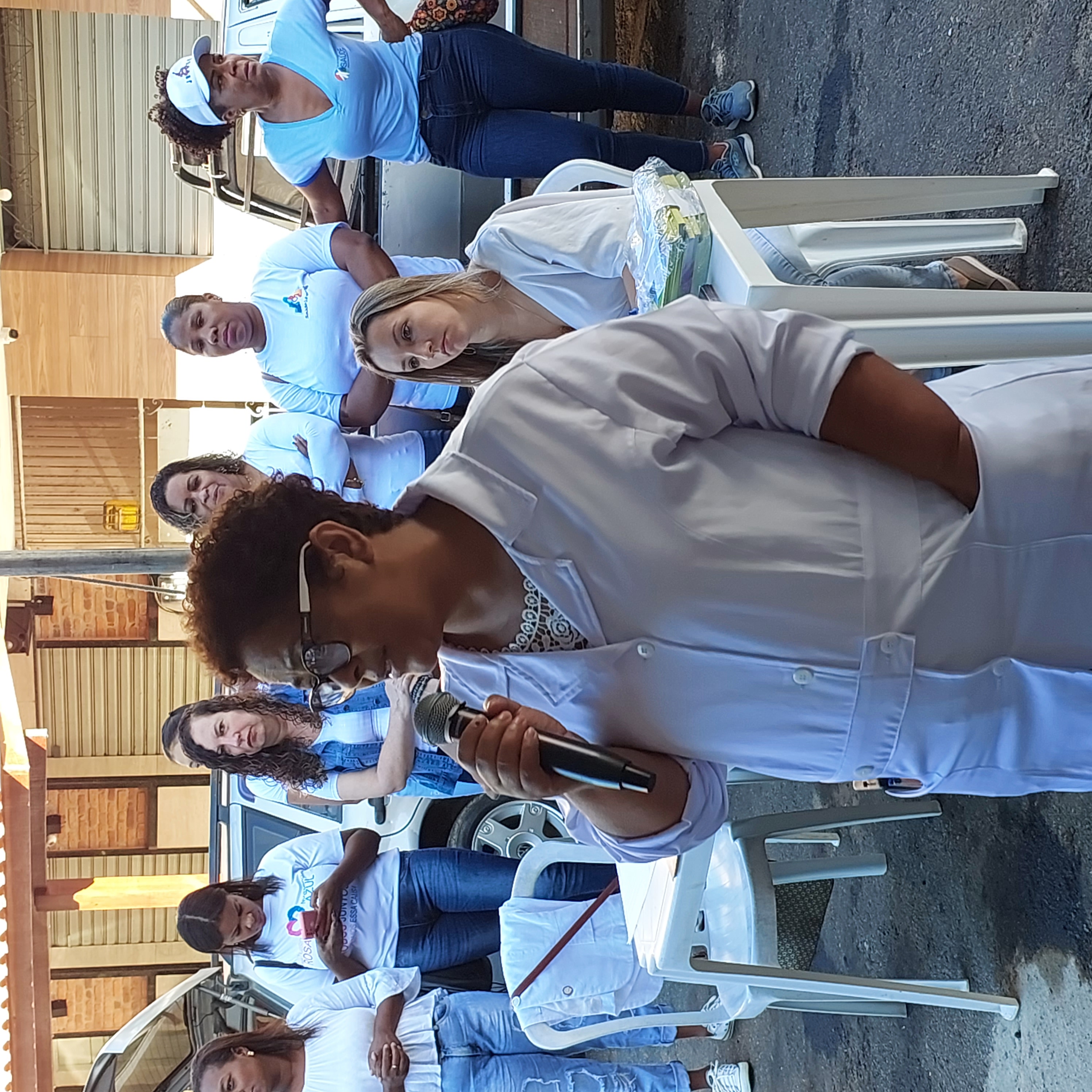 Ladeada pelas profissionais de saúde, a enfermeira Verônica Golinelli explica os objetivos da ação aos participantes