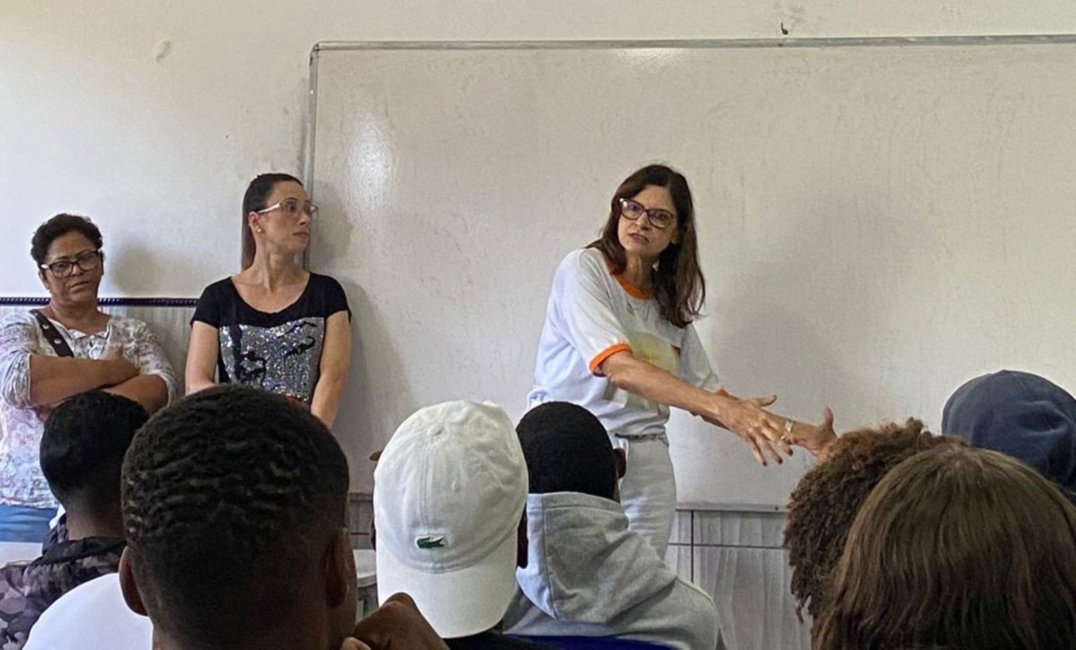 Numa linguagem simples e objetiva, a média Andreia Gentil conversou com as turmas ao lado das enfermeiras Verônica Golinelli e Denise Pereira
