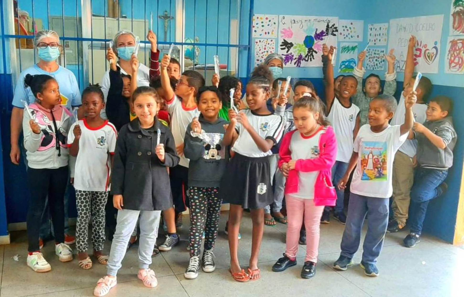 Garotada exibe as escovas mostrando que os ensinamentos da dentista e suas auxiliares de saúde bucal também foram prazerosos