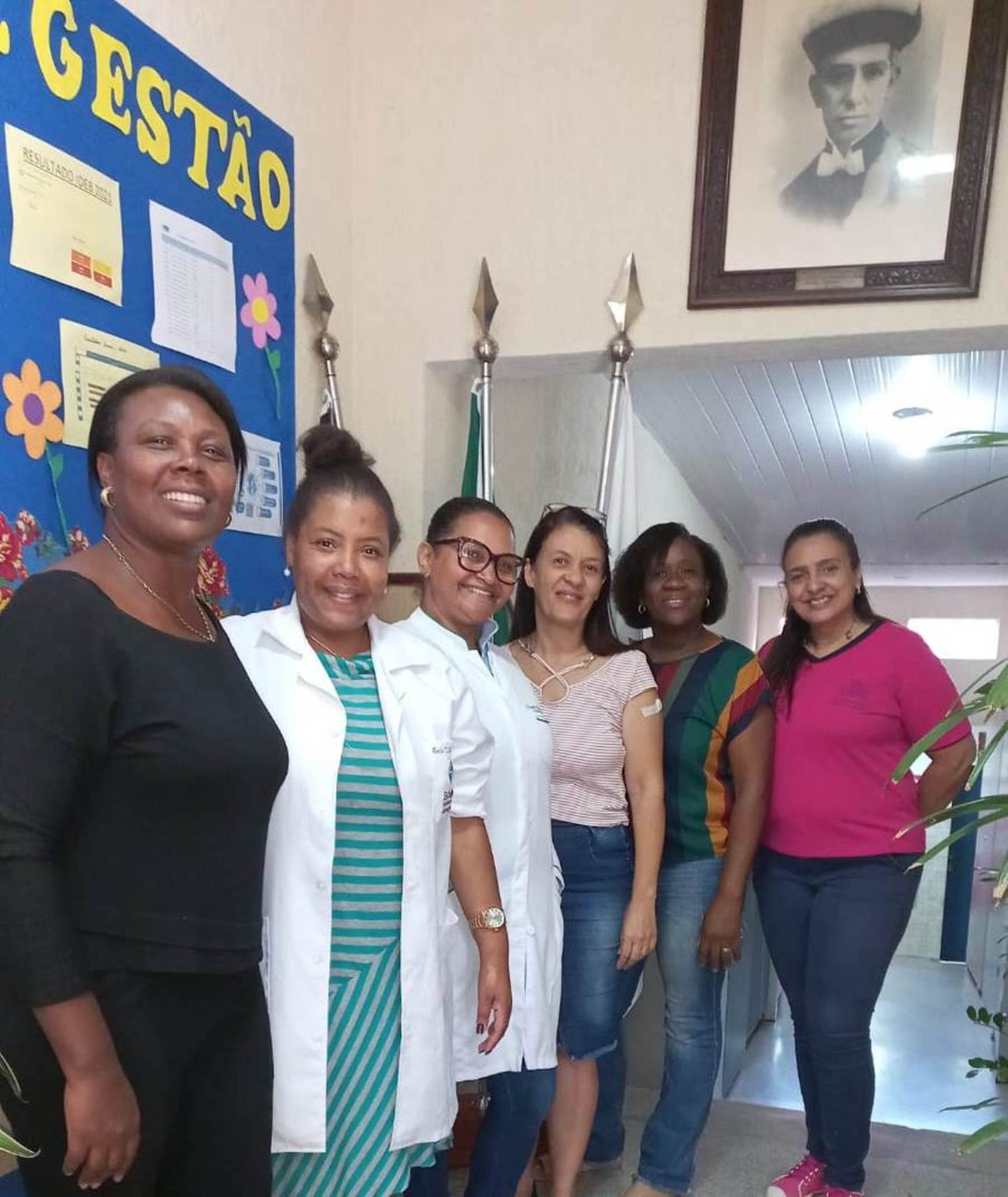Selfie mostra o bom entrosamento entre os profissionais de educação e saúde, que têm caminhado de mãos dadas em Macuco