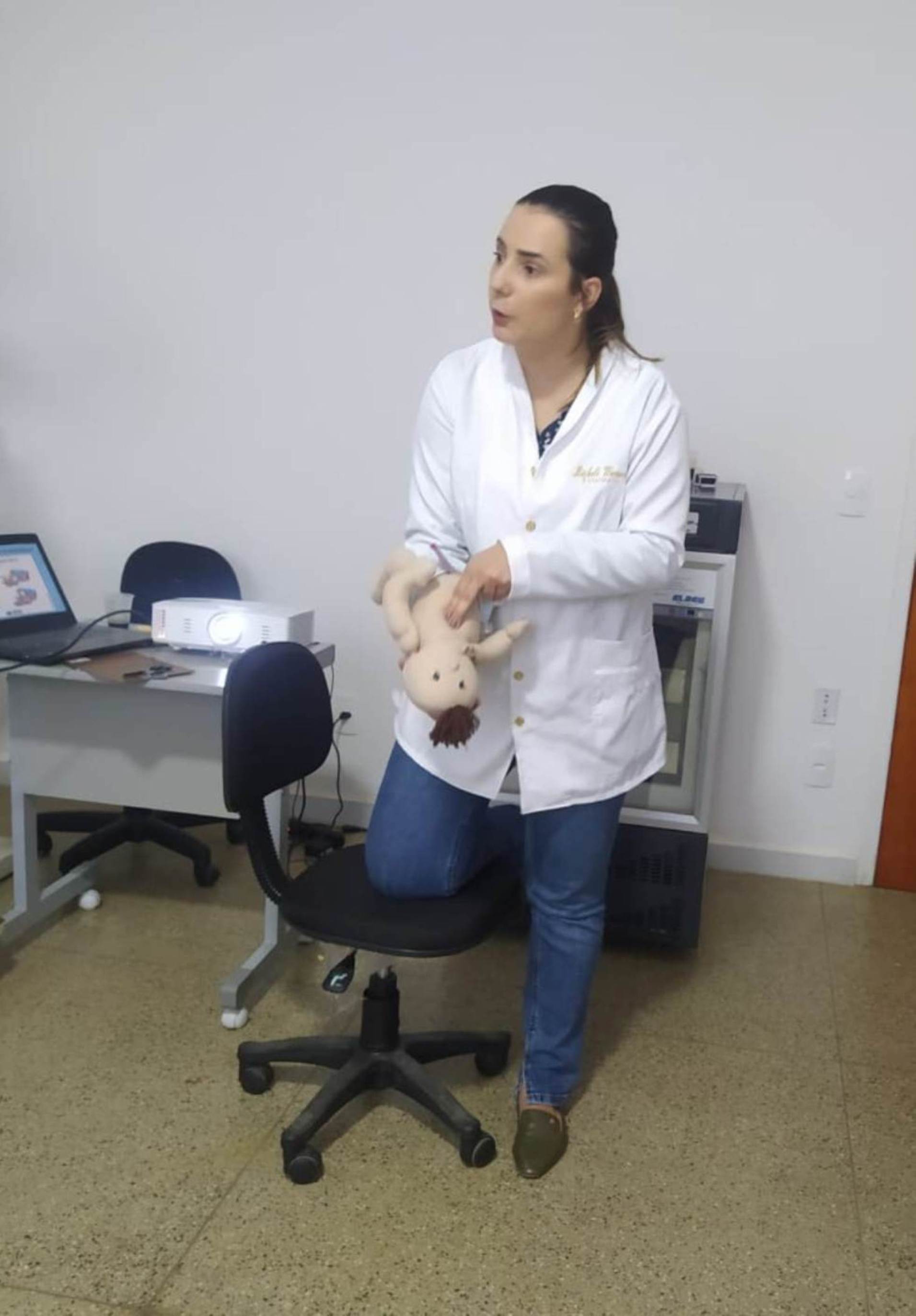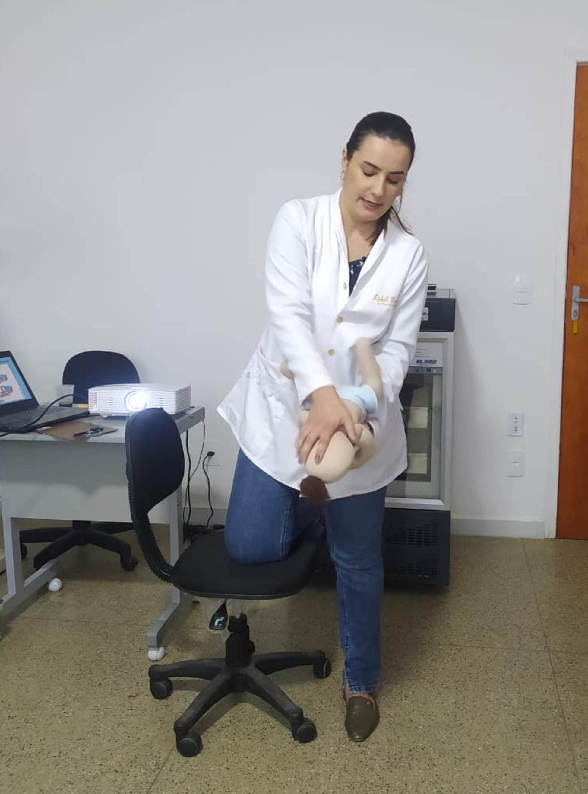 Os movimentos com uma boneca modelo simulam as intervenções necessárias caso haja a necessidade de socorrer o bebê