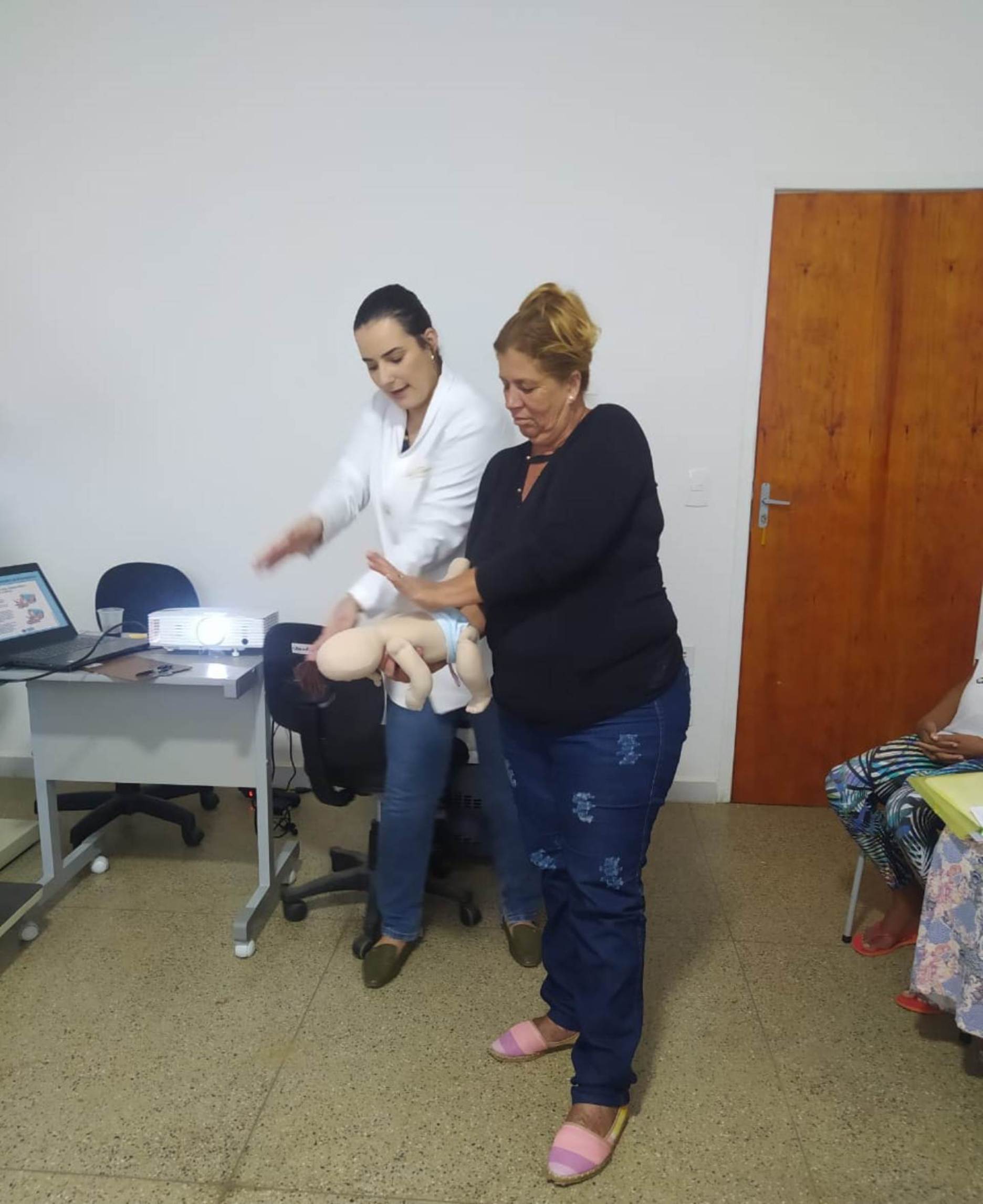Imagem mostra a familiar de uma das gestantes praticando na boneca modelo uma das manobras ensinadas