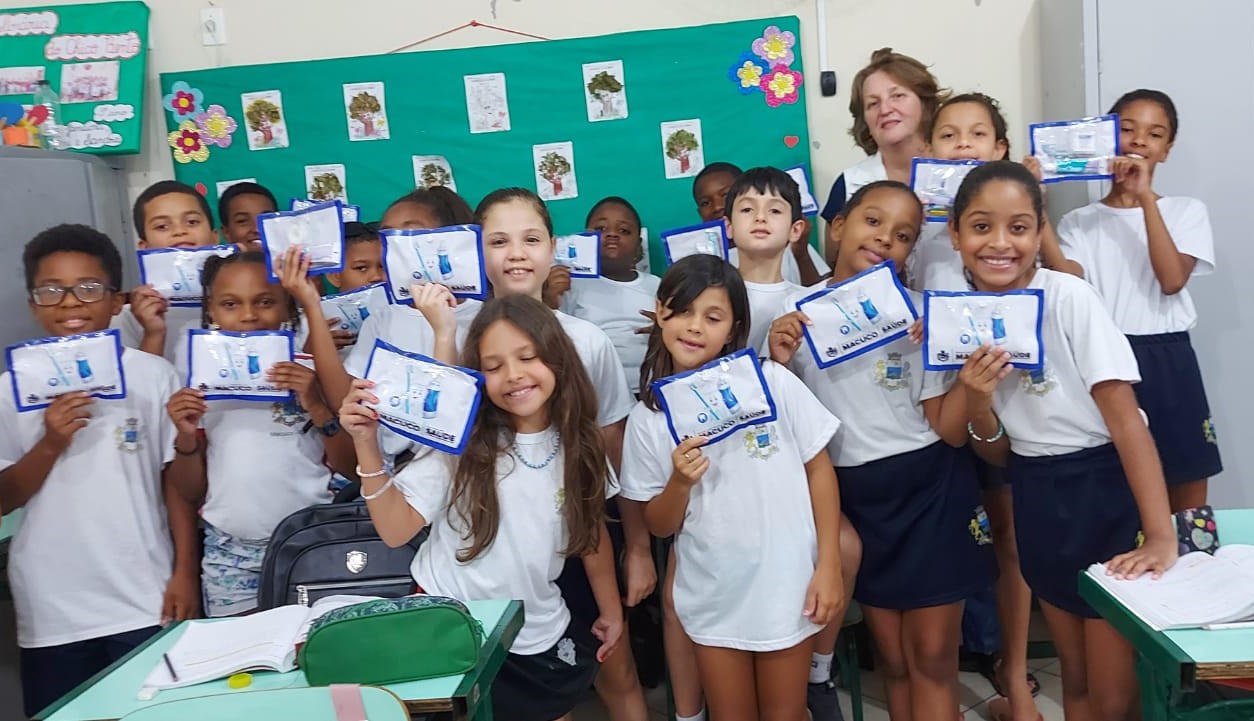 Estudantes de uma das escolas exibem o kit recebido da Coordenação de Odontologia da Secretaria de Saúde de Macuco