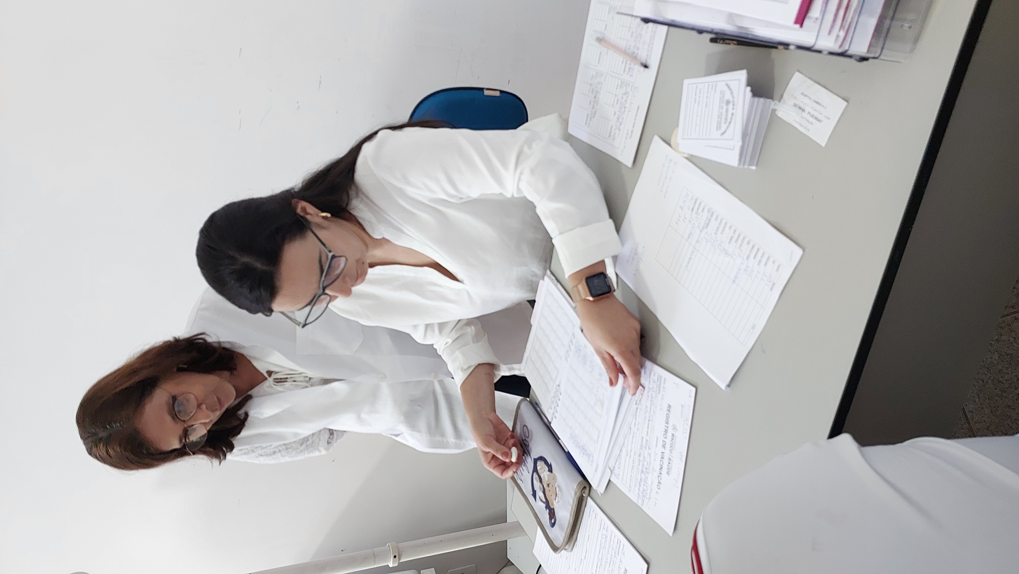 Enfermeira Micheli Werneck em ação com uma das companheiras de trabalho conferindo as anotações da ação