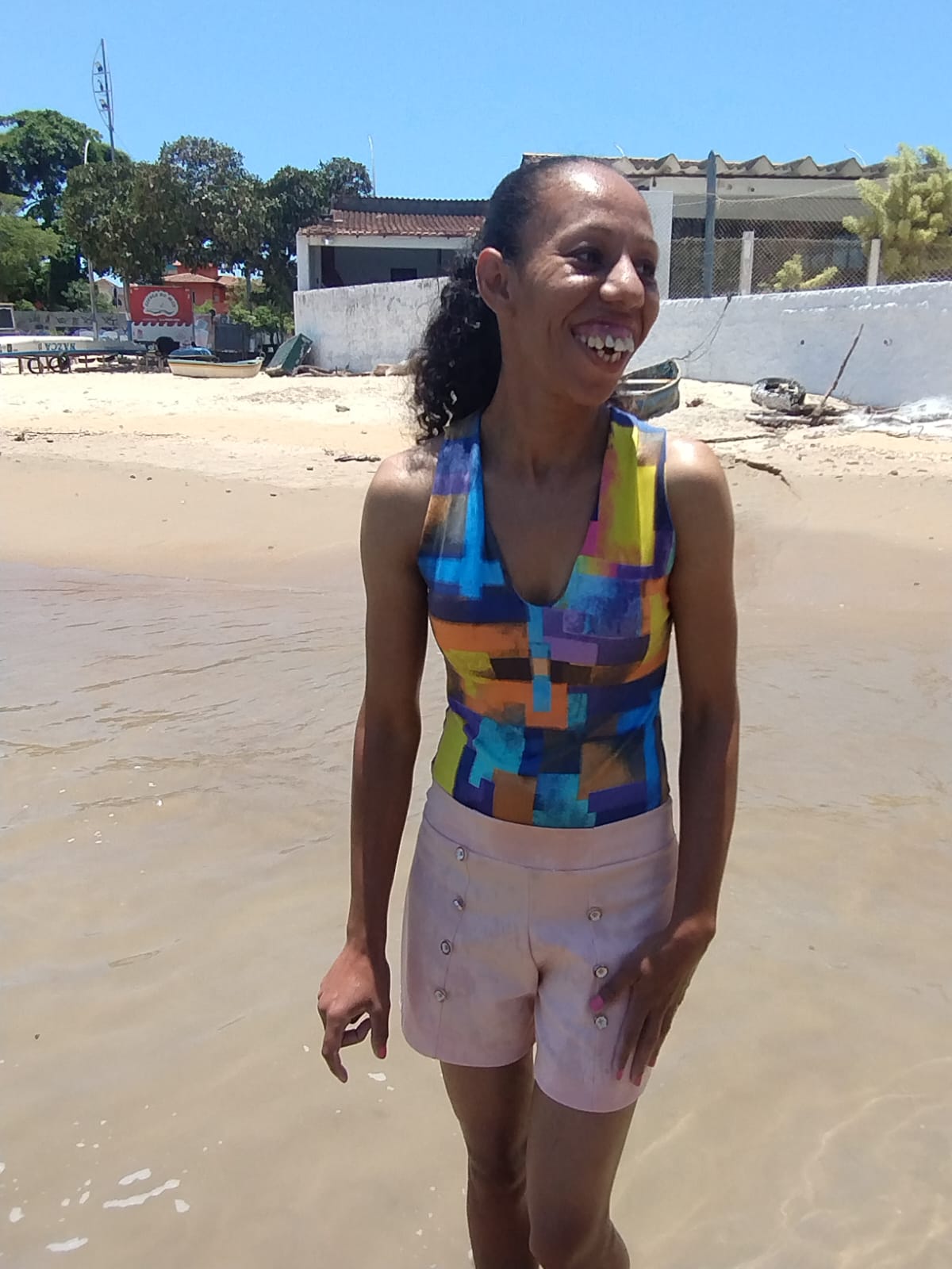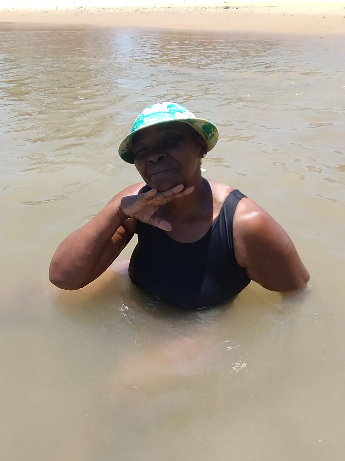 Mais uma pose para fotografia, dessa vez com a usuária se refrescando no calmo mar de Rio das Ostras