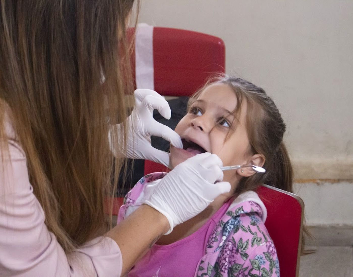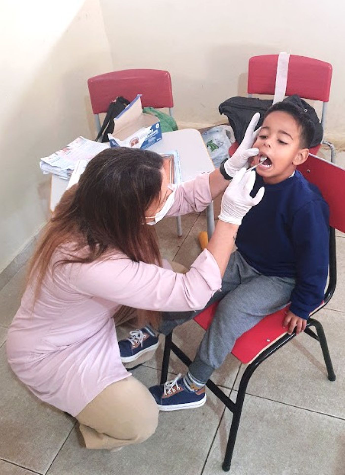 Mais um pequeno aluno tendo seus dentes examinados pela doutora Shirle Campos, dando sequência ao projeto de parceria entre Saúde e Educação