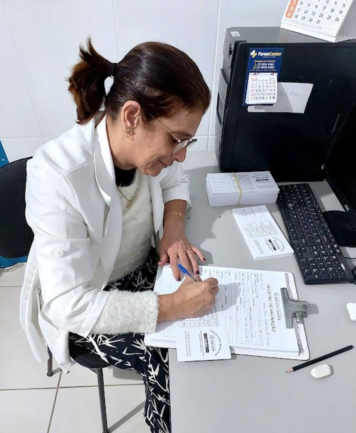 Uma das integrantes da equipe de saúde preenche dados sobre a Caderneta de Vacinação, já que muitas mulheres da cidade aproveitaram para colocá-la em dia