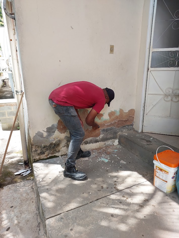 Profissional retirando pedaços do reboco numa área externa do Centro de Saúde visando melhorar na sequência a qualidade da parede do lado de fora da unidade
