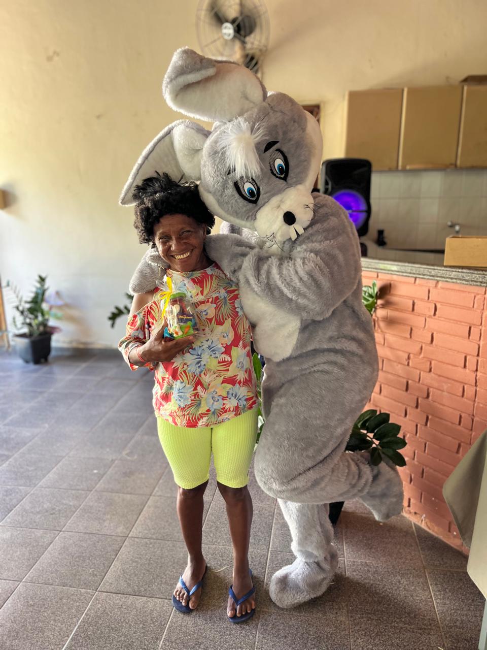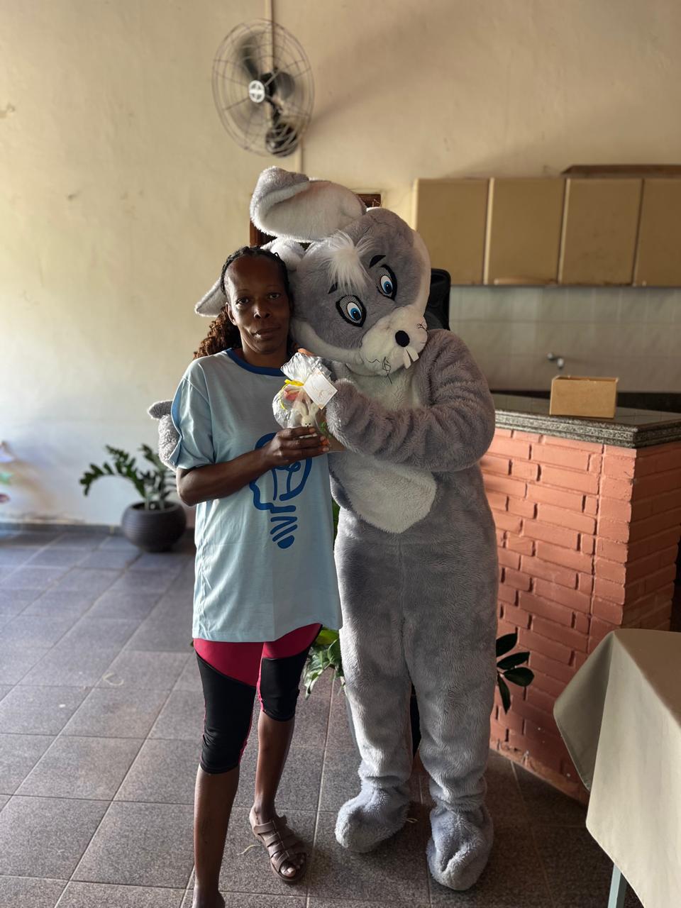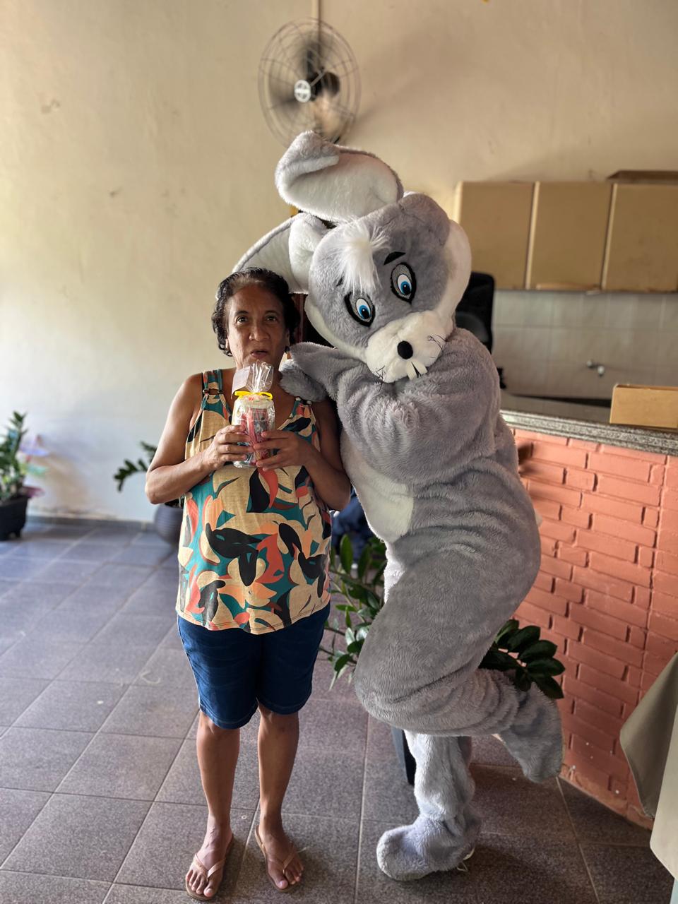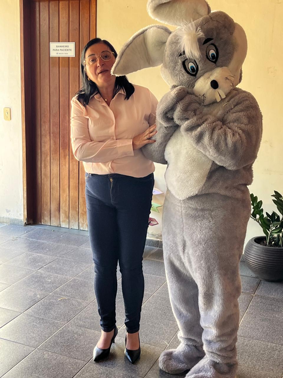 A secretária Ana Paula Gonçalves entrou no espírito da festa ao lado do coelhinho, trazendo ainda mais alegria para o dia dos os usuários do CAPS/Macuco