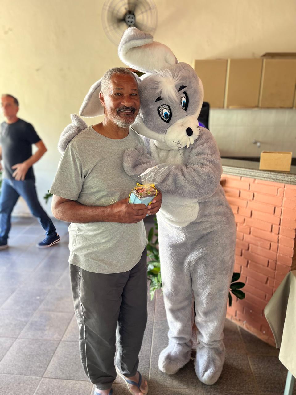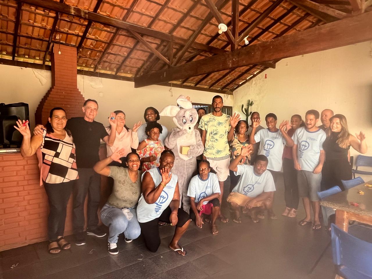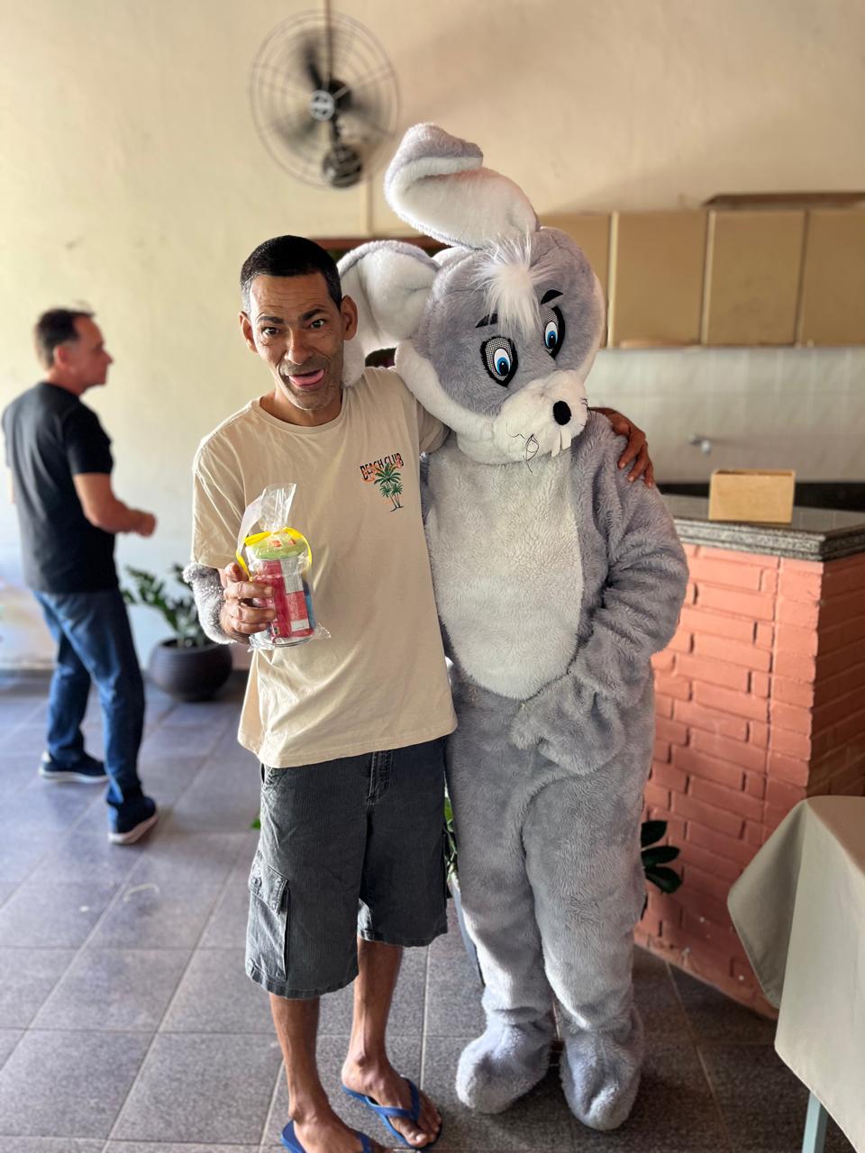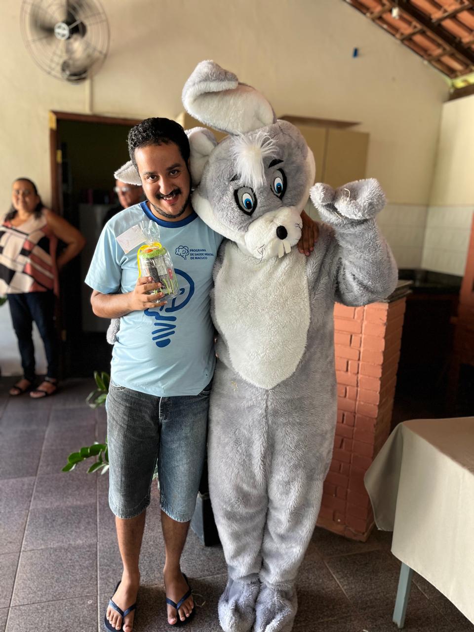 Um abraço do coelhinho que renova e exibe a alegria de celebrar a Páscoa no CAPS de Macuco estampada no rosto de cada usuário