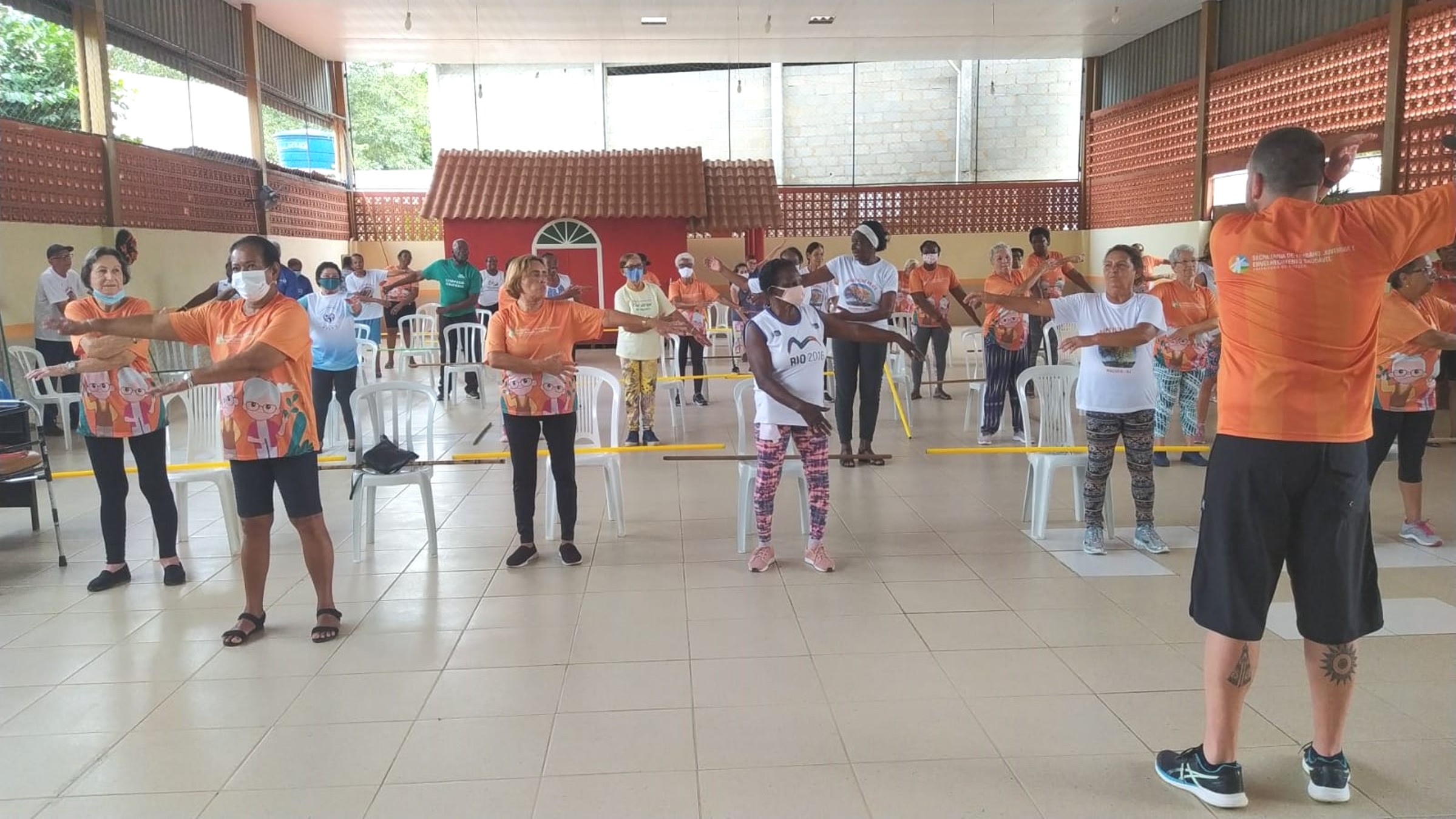 Orientado pelo educador físico, o grupo se exercita na sede da Secretaria de Trabalho, Envelhecimento Saudável e Juventude