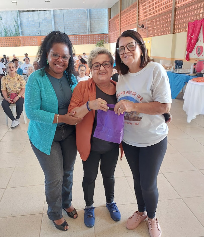 Mais uma das integrantes da terceira idade recebendo seu brinde das mãos de Margareth Anselmo e Ramile Fonseca
