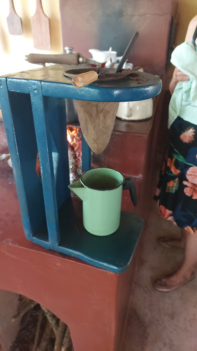 Não poderia faltar, na velha fazenda regional, o bom café da manhã coado no coador de pano ao estilo antigo