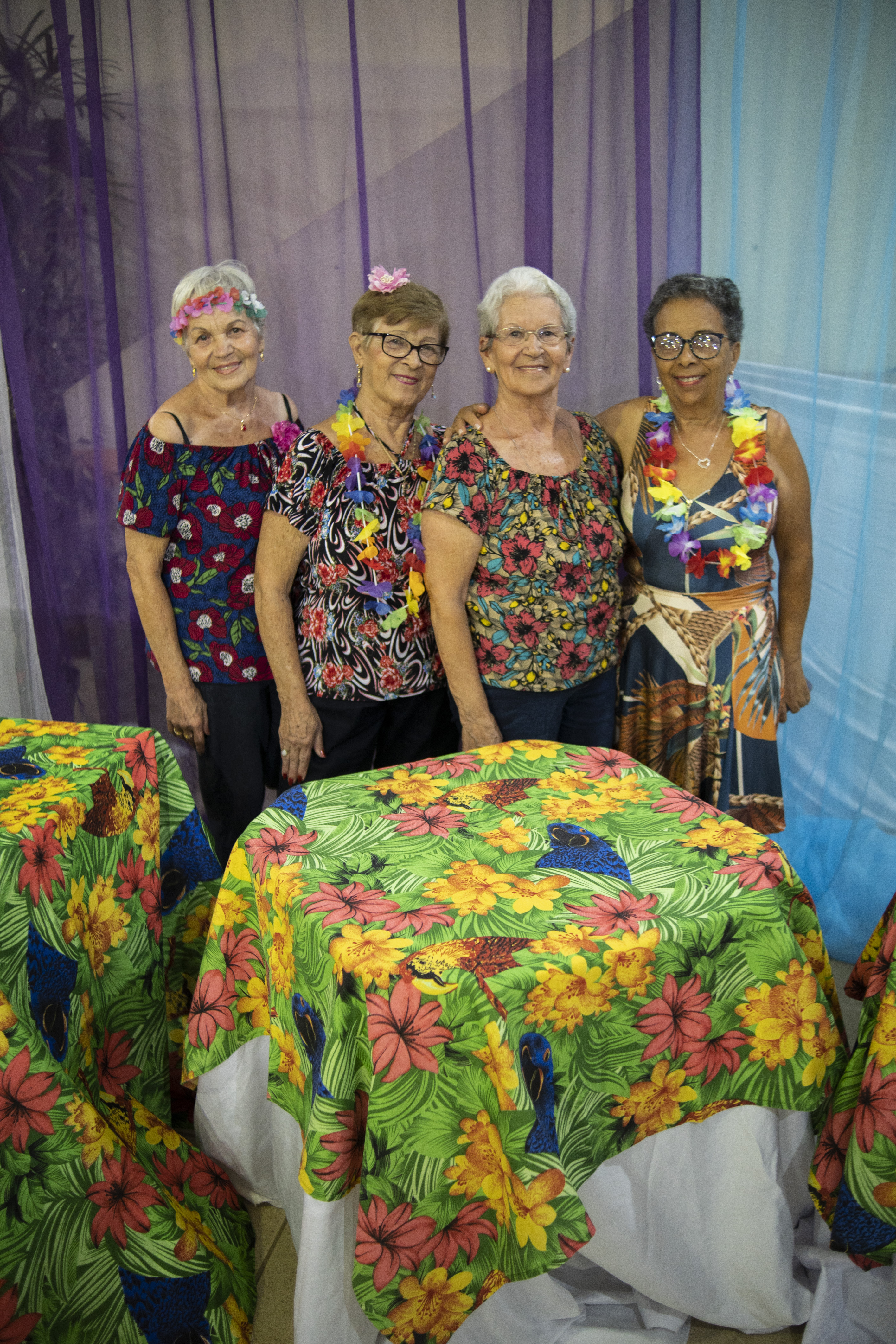Secretária Margareth Anselmo e algumas de suas convidadas, esbanjando simpatia e elegância na Festa Tropical