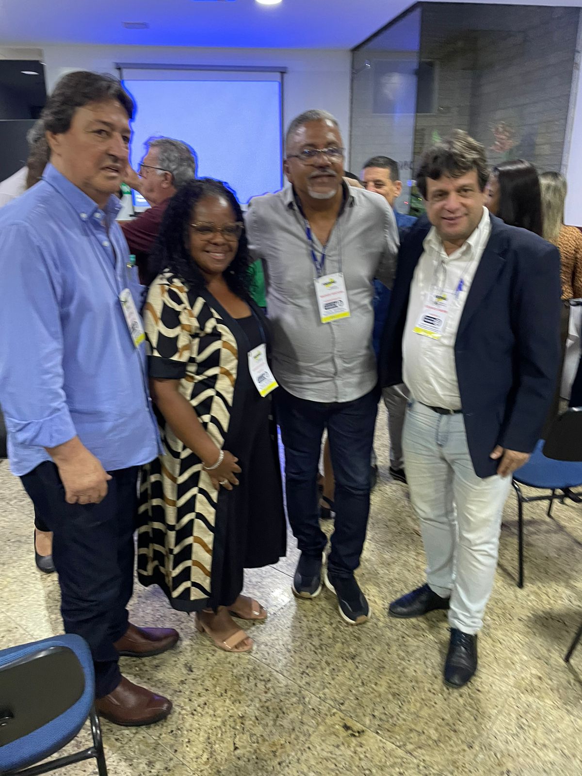 Margareth posa para foto com vice-prefeito de São Gonçalo, Sérgio Gevú, sub-secretário de São Gonçalo, Wagner Ventura, e presidente do FORTRAB e Secretário de Trabalho e renda de Nilópolis Dudu Amorim