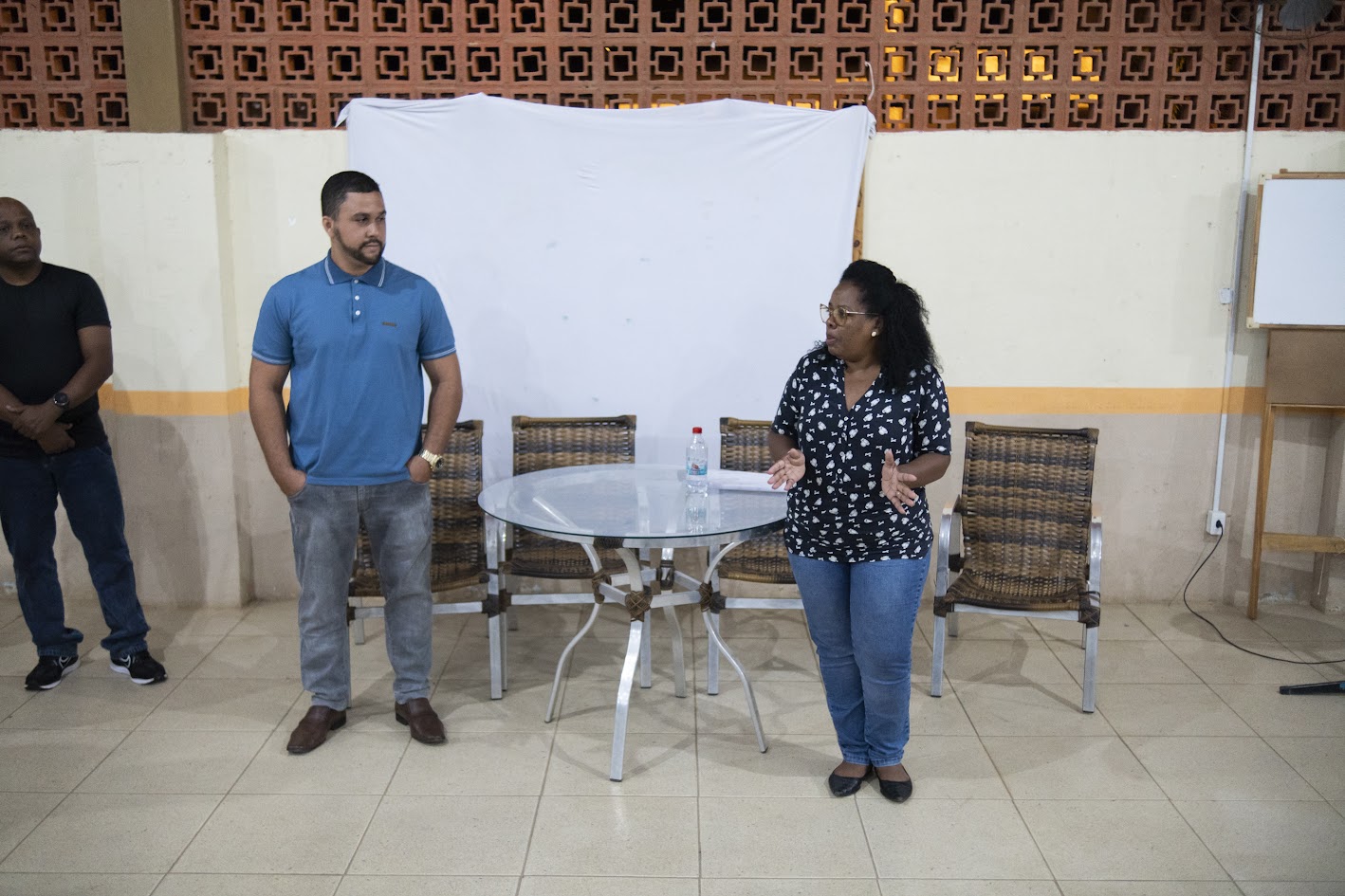 Secretária Margareth Anselmo conversando com o instrutor do SENAI antes da apresentação aos alunos do curso