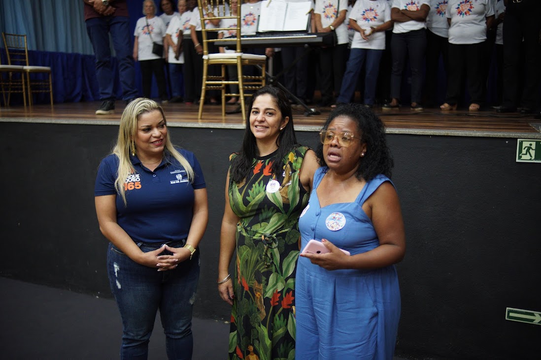 Secretária Margareth Anselmo e subsecretária Elaine Lopes com a representante do Governo do Estado durante o evento em Cantagalo