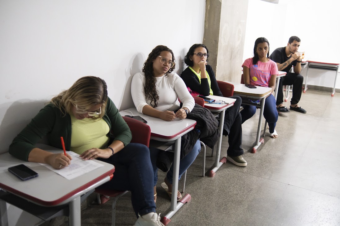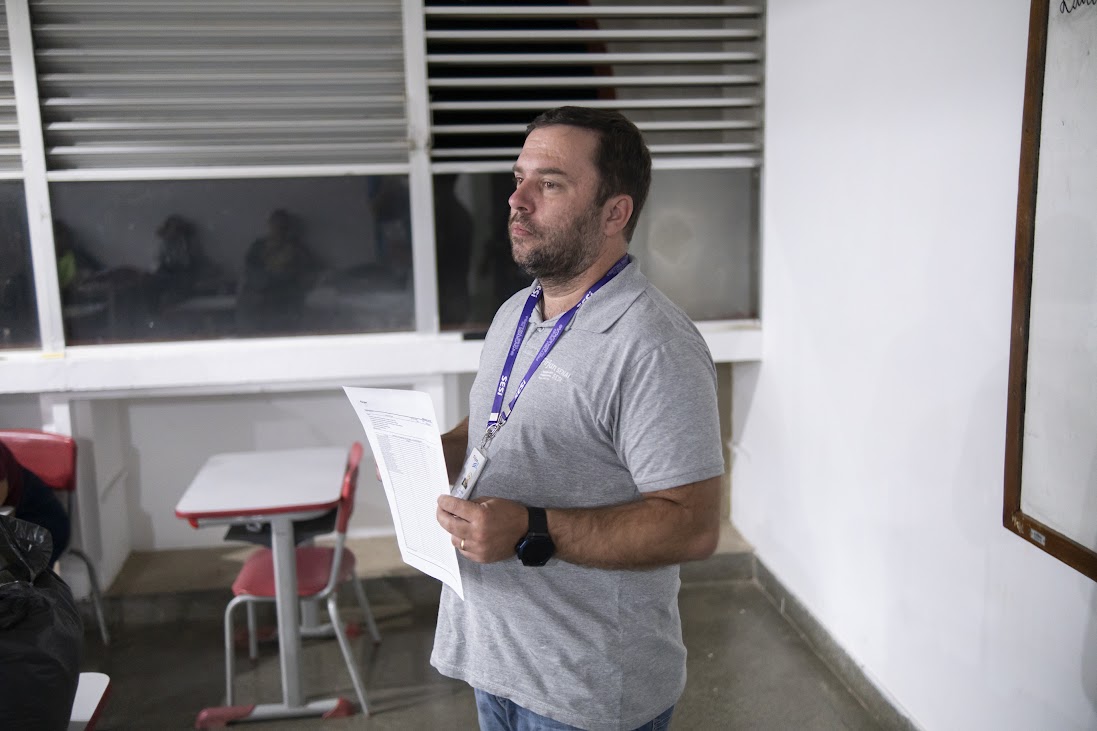 Os novos alunos acompanham a Aula Inaugural realizada no CIEP Honório Peçanha, no bairro da Reta, em Macuco
