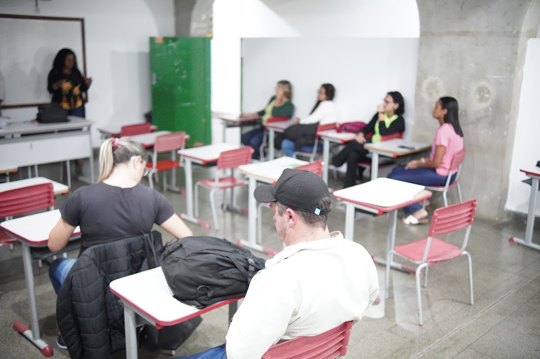 Ao fundo, a secretária de Trabalho de Macuco dá boas-vindas aos novos matriculados dos cursos de Programador e Controlador de Produção