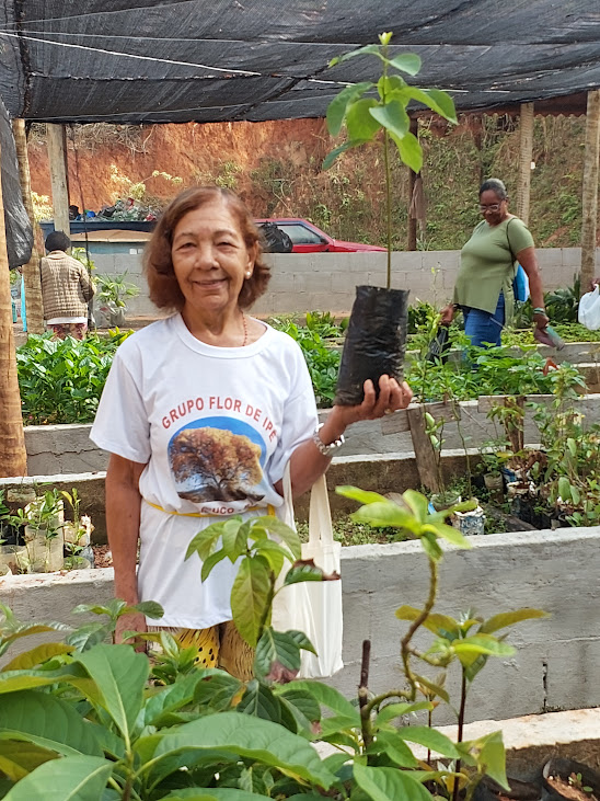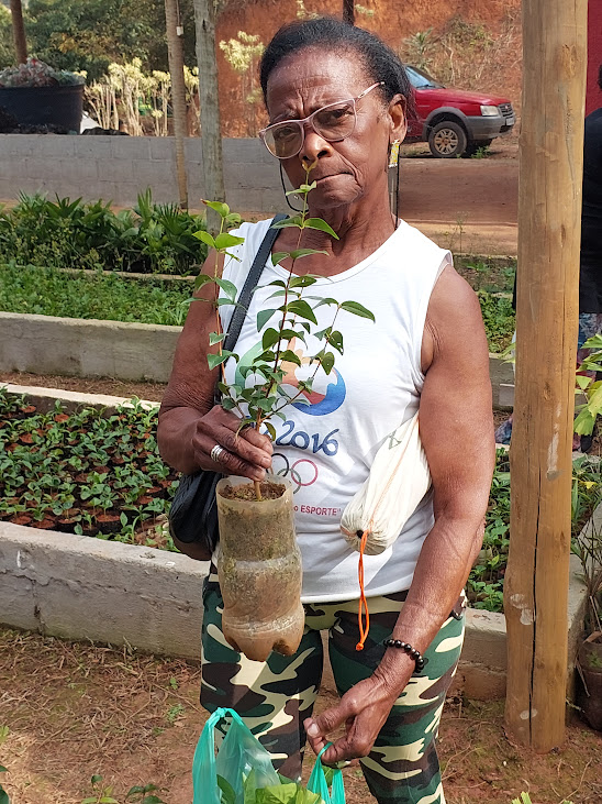 Mais uma das integrantes do Grupo da Terceira Idade feliz em poder receber uma das espécies produzidas no Horto Municipal Junot Abi-Râmia