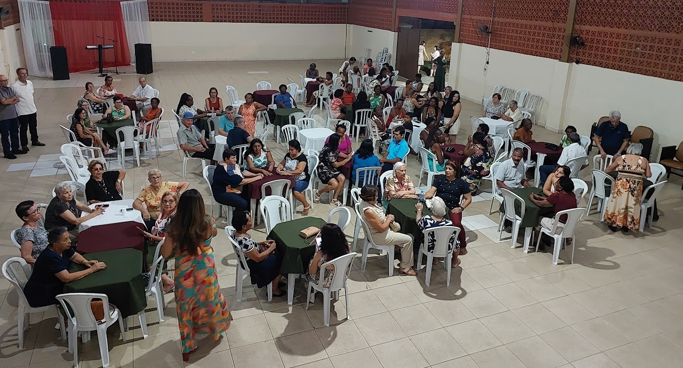 Mesas dispostas no salão e muito bate-papo também marcaram a noite de confraternização da terceira idade