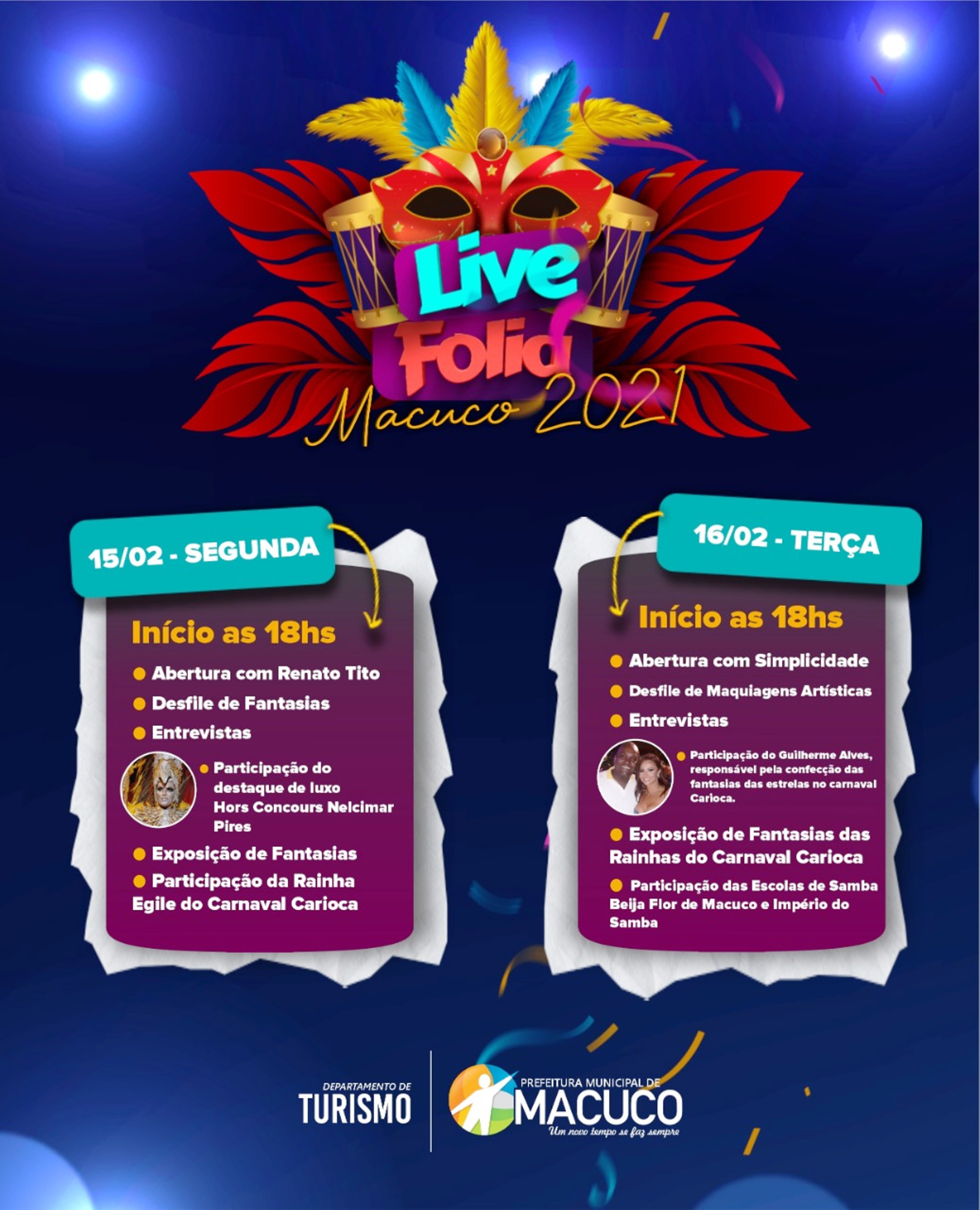 “Tudo será feito com rigor e responsabilidade. Teremos grandes atrações, como entrevistas com personagens do carnaval carioca, desfile e exposição de fantasias e shows. Agradeço ao prefeito, demais companheiros de gestão e a todos os envolvidos com esse evento inédito que será um sucesso em nossa cidade”, garantiu Maurício Góes, diretor do Departamento de Turismo de Macuco.