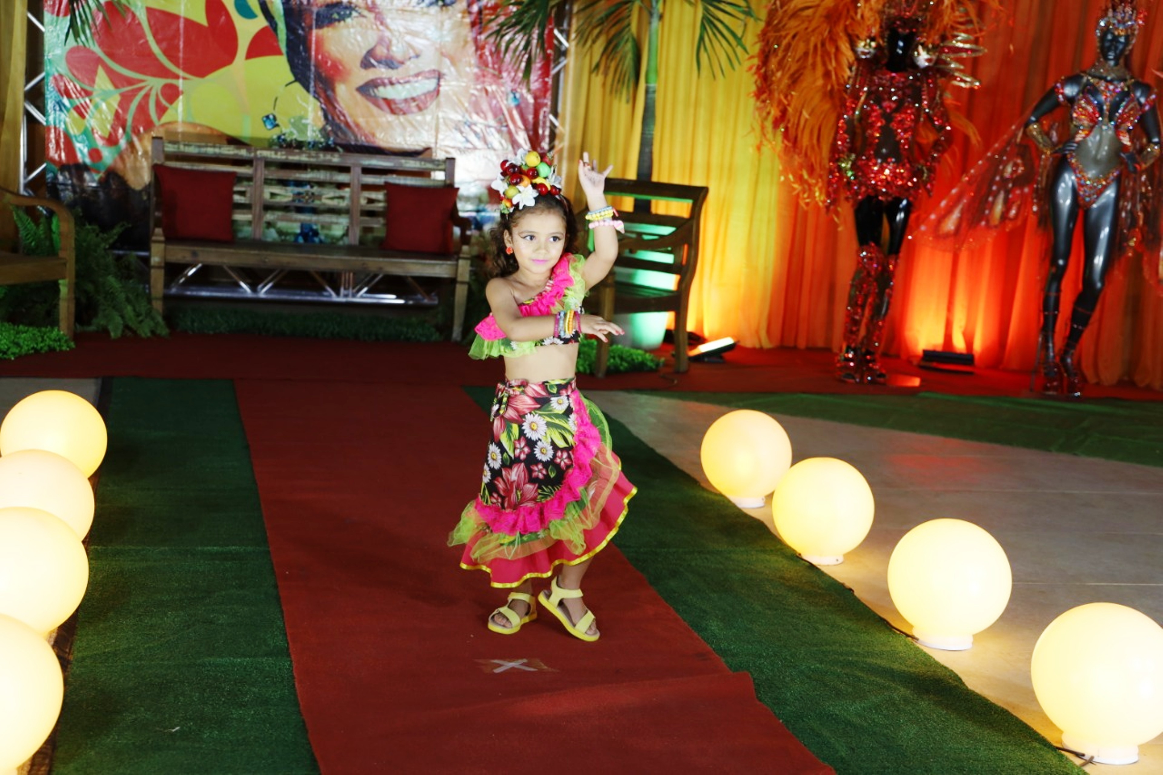 A pequena modelo reproduz uma fantasia imortalizada por Carmem Miranda