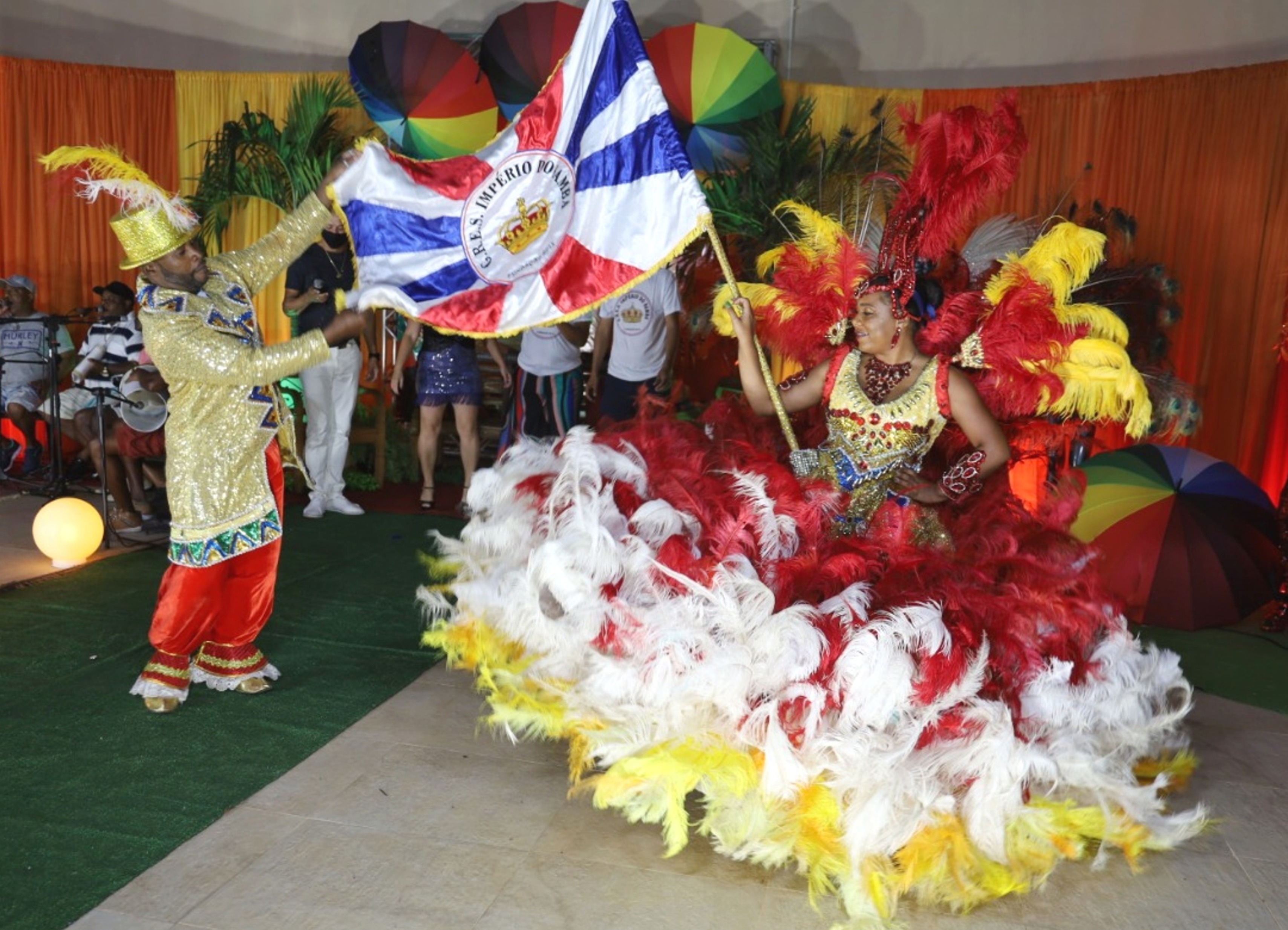 Porta-Bandeira e Mestre-Sala exibem o pavilhão da Escola Império do Samba