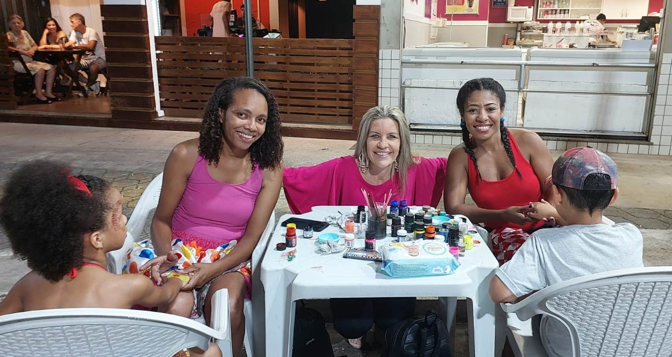 Michelle Bianchini se confraternizando com as artistas que pintaram a garotada durante as matinês em Macuco