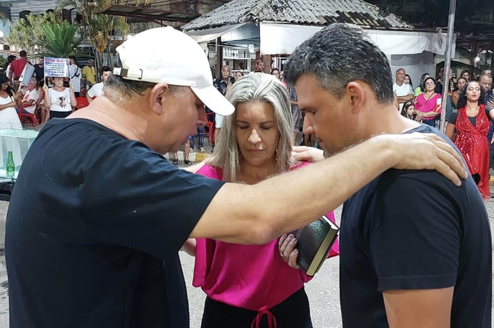 Momento em que a prefeita Michelle Bianchini e o esposo e secretário de Governo e Gestão João Vitor Pontes oraram com o Pastor Rogê Malinosky