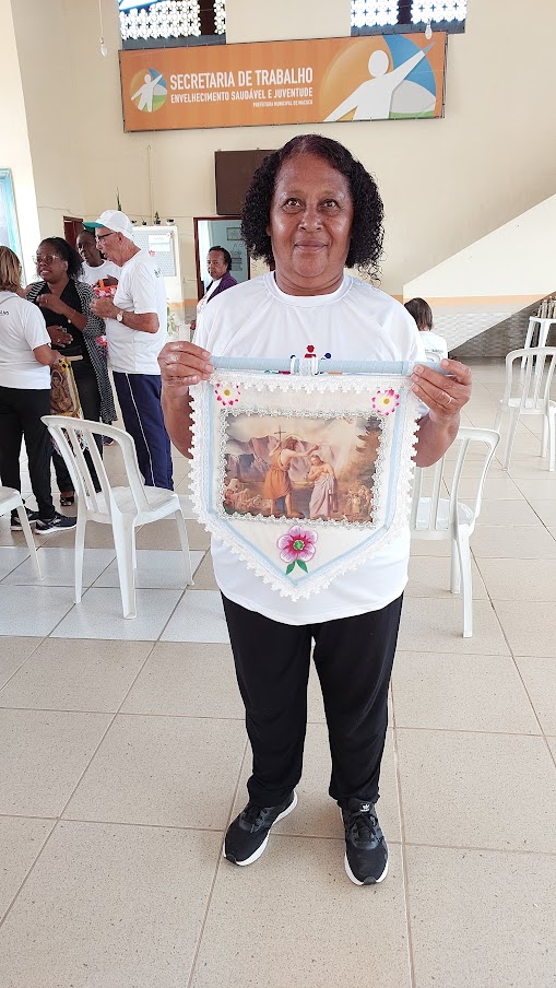Integrantes do Grupo da Terceira Idade exibem o resultado final do aprendizado da Oficina de Estandartes