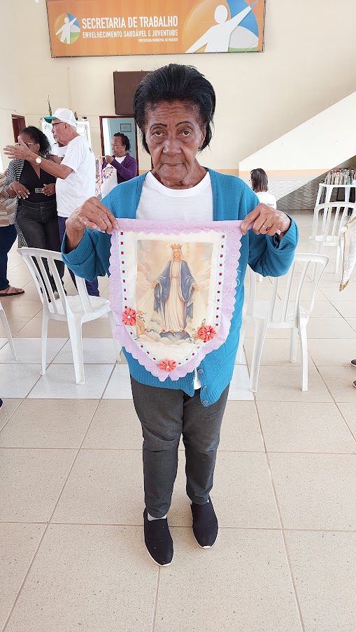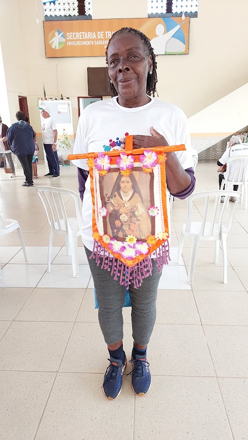 Margareth Anselmo (ao centro) conversa com as integrantes do Grupo da Terceira Idade durante a apresentação dos estandartes