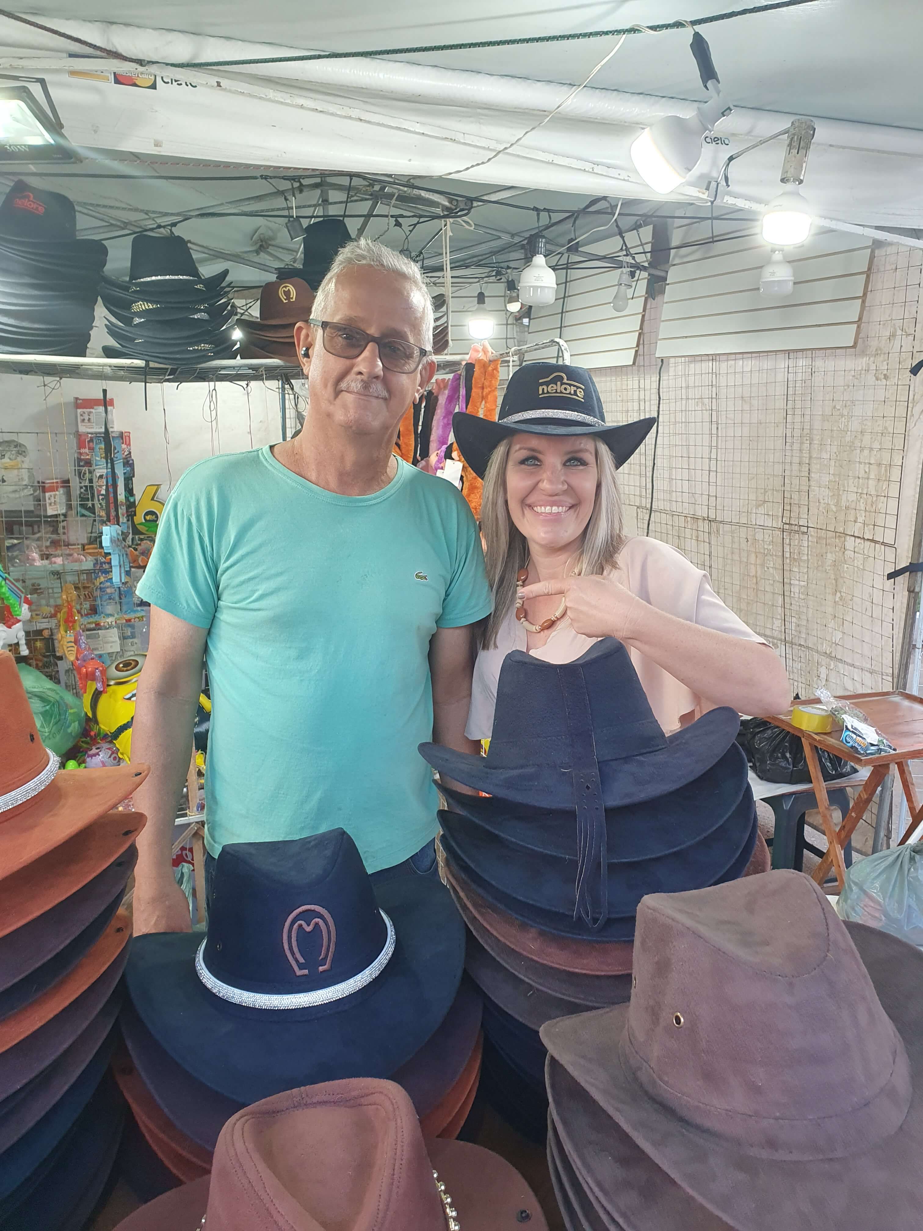 Bem-humorada, a prefeita brincou com um comerciante de chapéus e afins