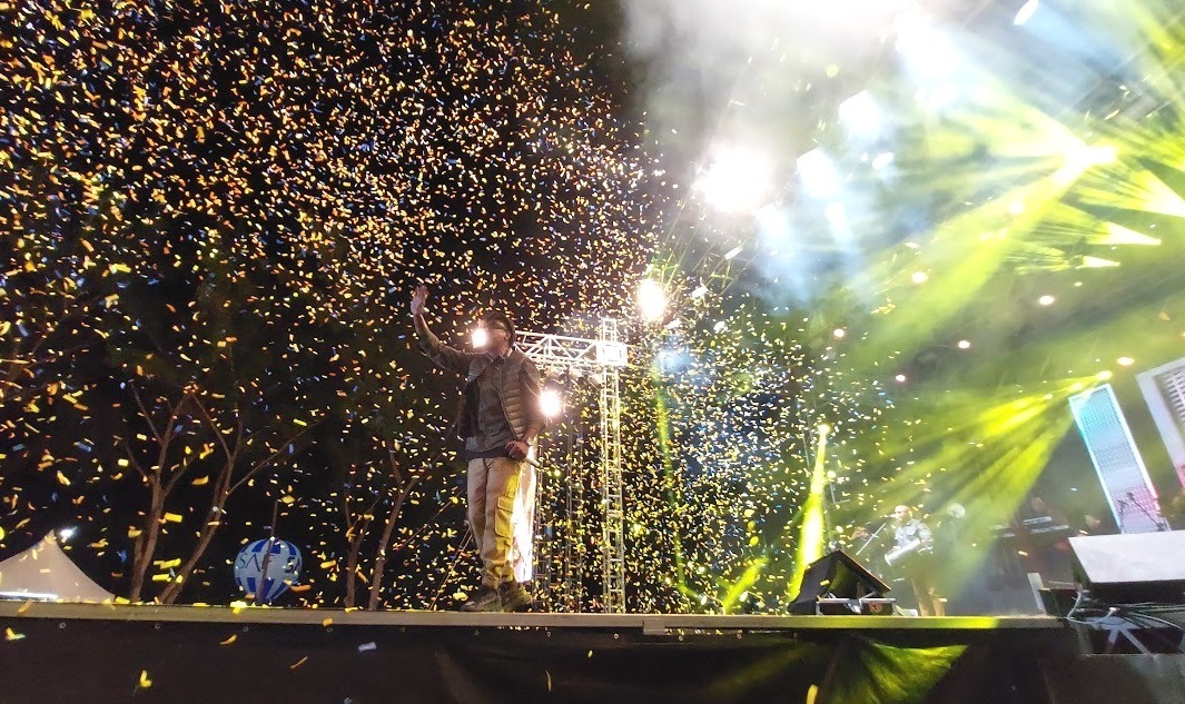 Em meio a uma chuva de papel picado, parte da produção especial, o vocalista da banda interagiu com os fãs