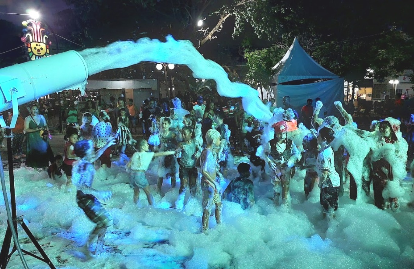 Festa de carnaval tem que ter o tradicional banho de espuma, que esse ano em Macuco está fazendo a festa da criançada