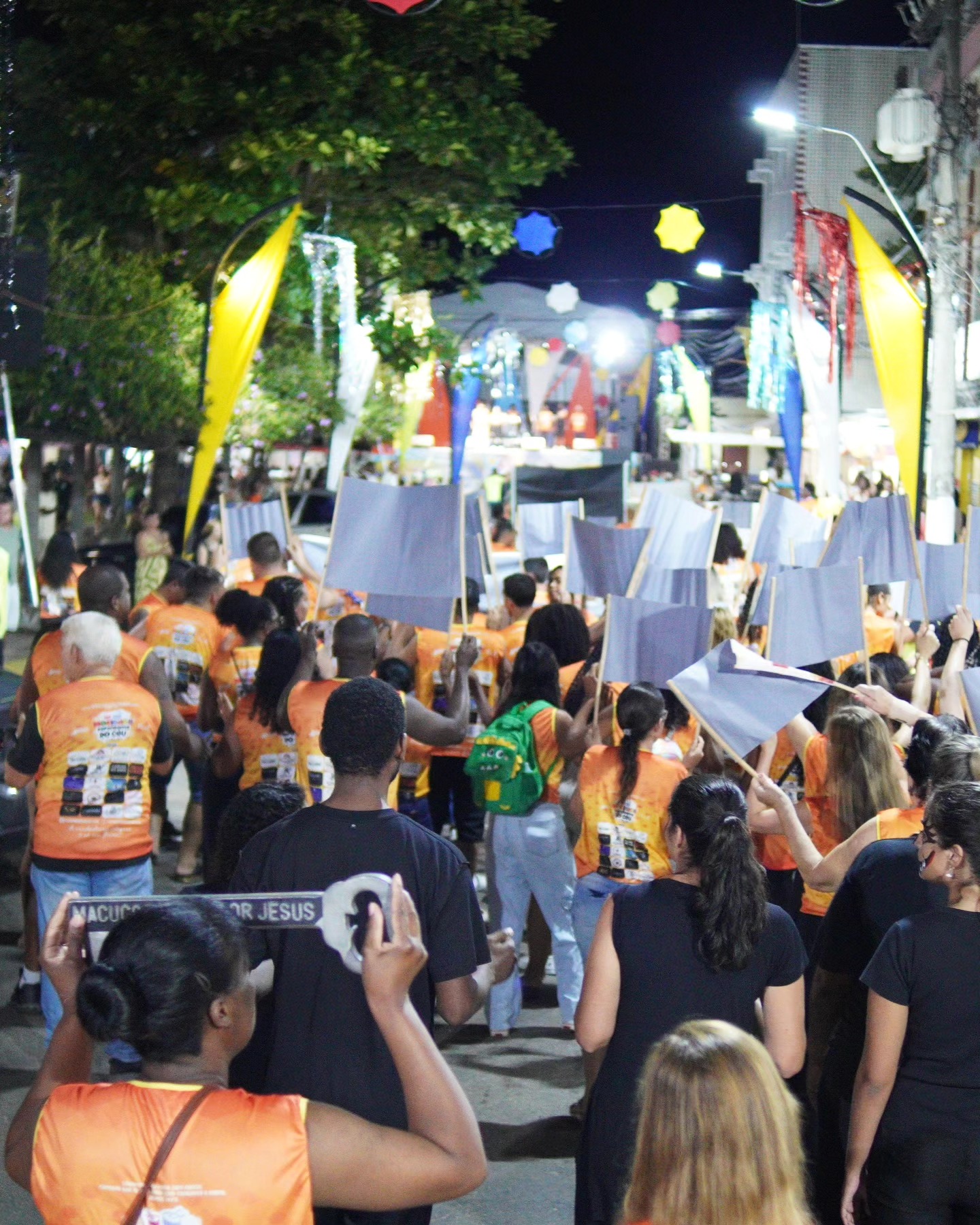 Expondo cartazes com mensagens positivas, a juventude do Bloco Maranata desfila pelas ruas se integrando à programação oficial
