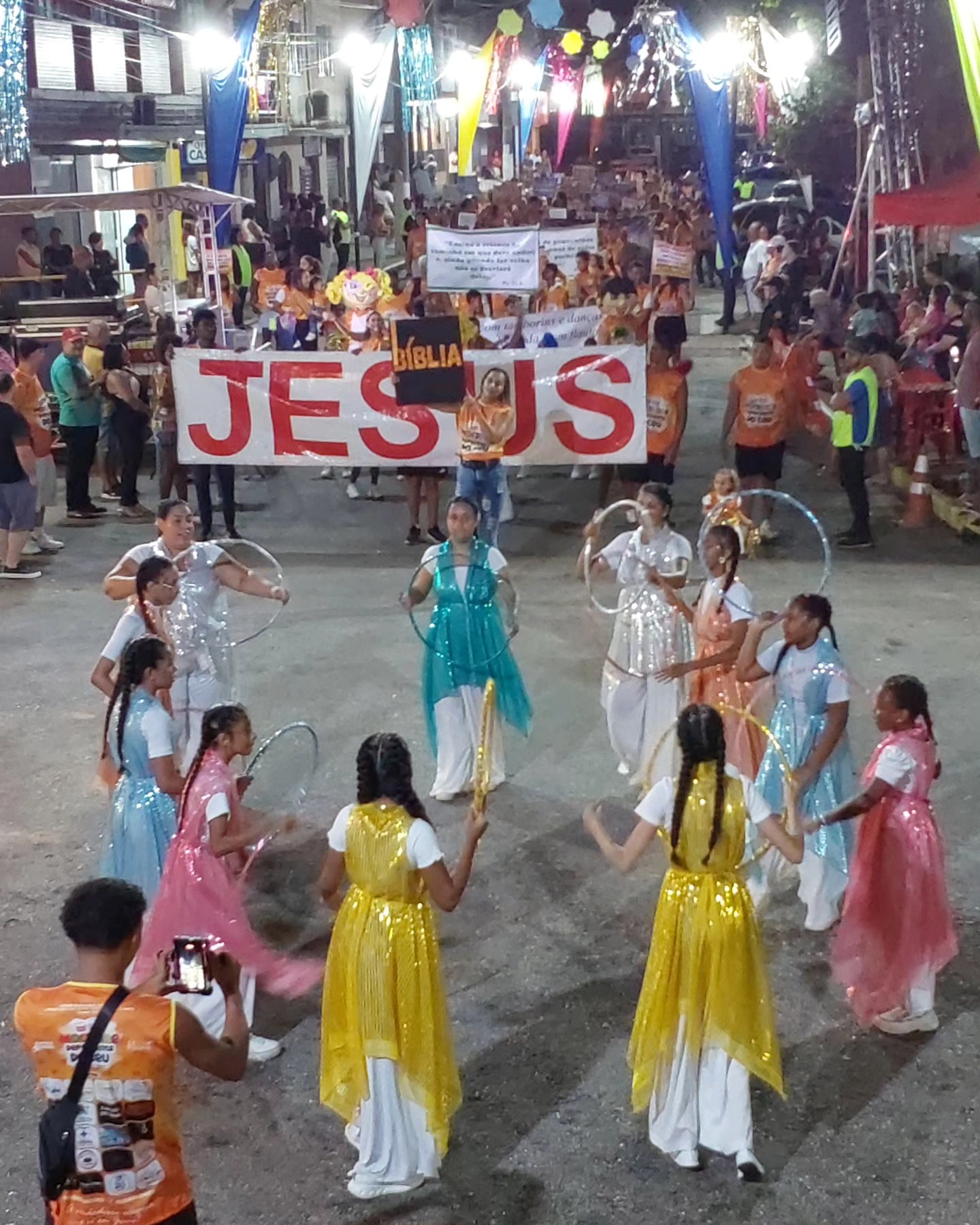 Imagem emblemática e reflexiva em pleno carnaval, com os fiéis do Bloco Maranata mostrando que a fé está presente em todos os momentos