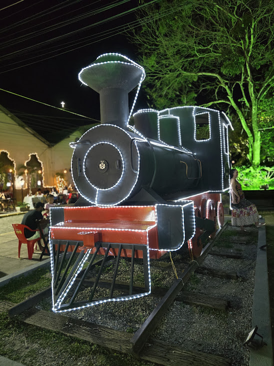 Até a réplica da Maria Fumaça ficou toda iluminada para receber os festejos natalinos com muitas luzes e vibração