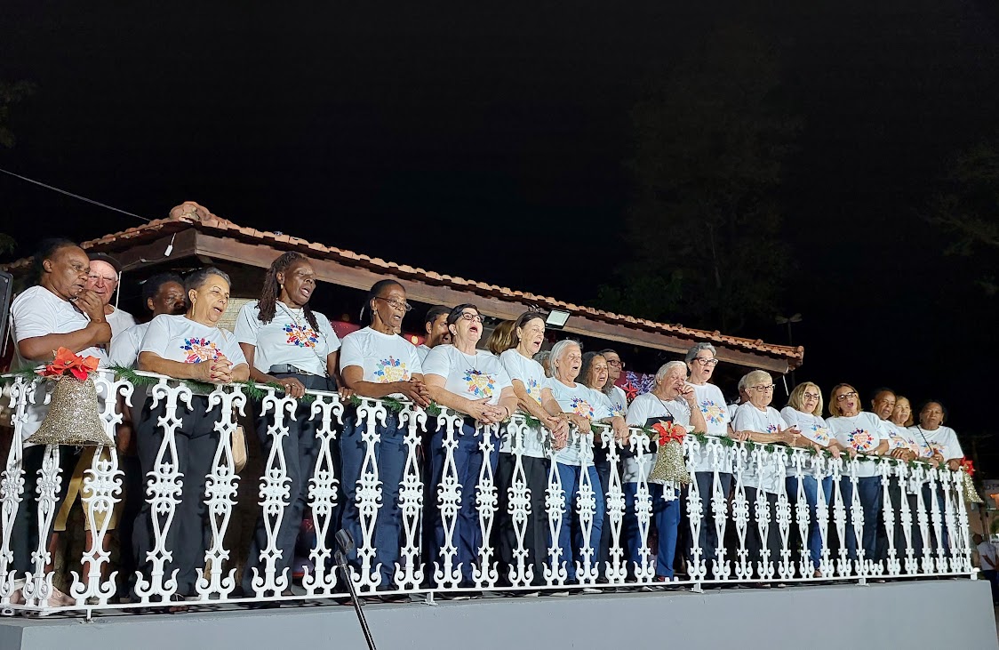 Regido pelo competente maestro Marcelo Juliano, o Coral da Terceira Idade Flor de Ipê foi uma das ótimas atrações da inauguração das Luzes de Natal