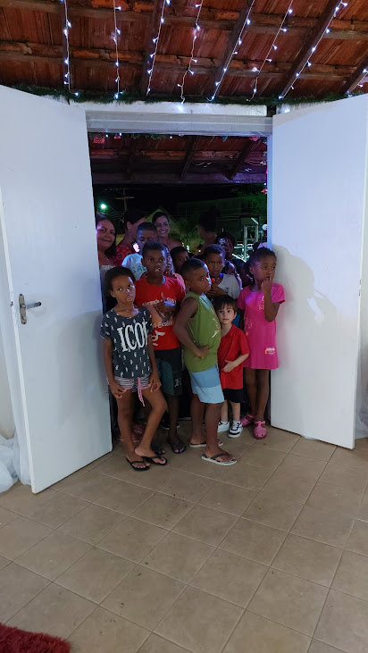 Uma imagem simbólica e comovente: as crianças aguardando o momento da chegada do Papai Noel n entrada da Casinha do Bom Velhinho